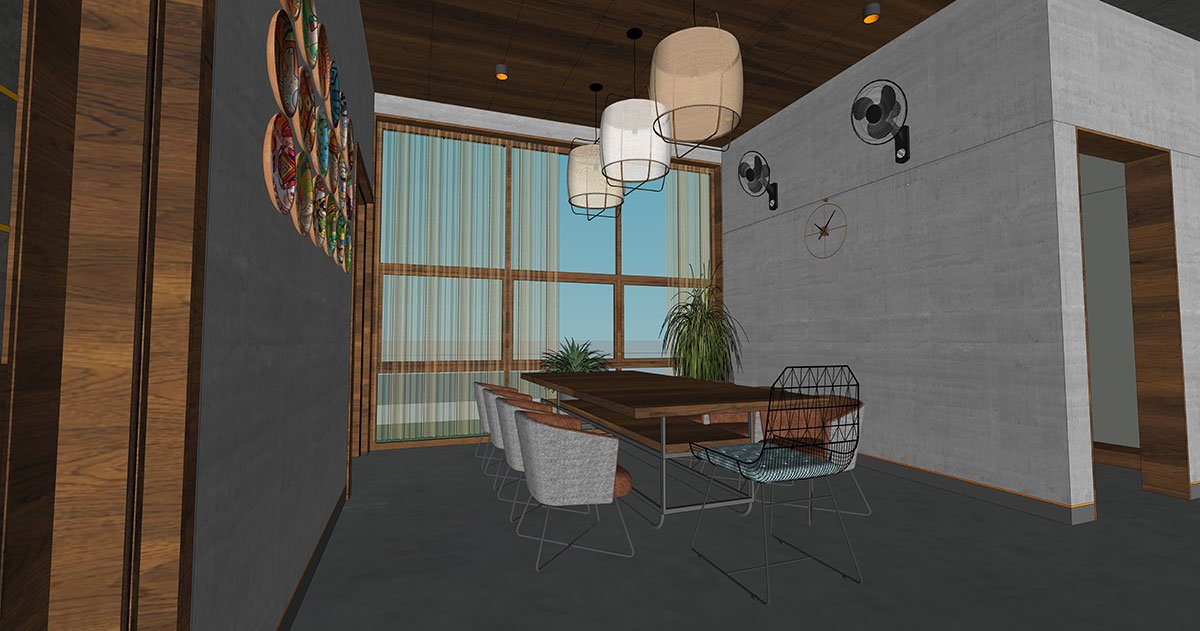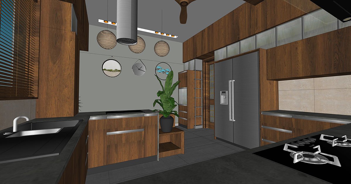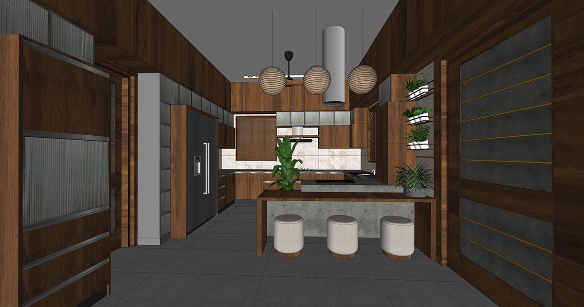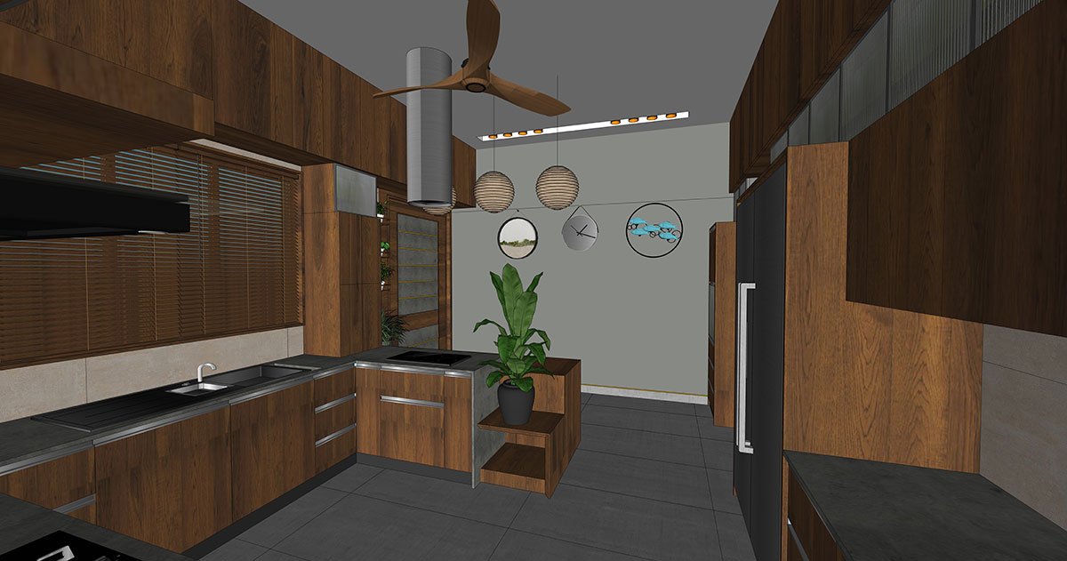 The wooden-themed kitchen is presented as a homemaker’s dream, baked as a modular C-shaped workspace with an appetising breakfast table, finished in grey and wooden counters. From the kitchen, it leads to a linear work area and a servant room.