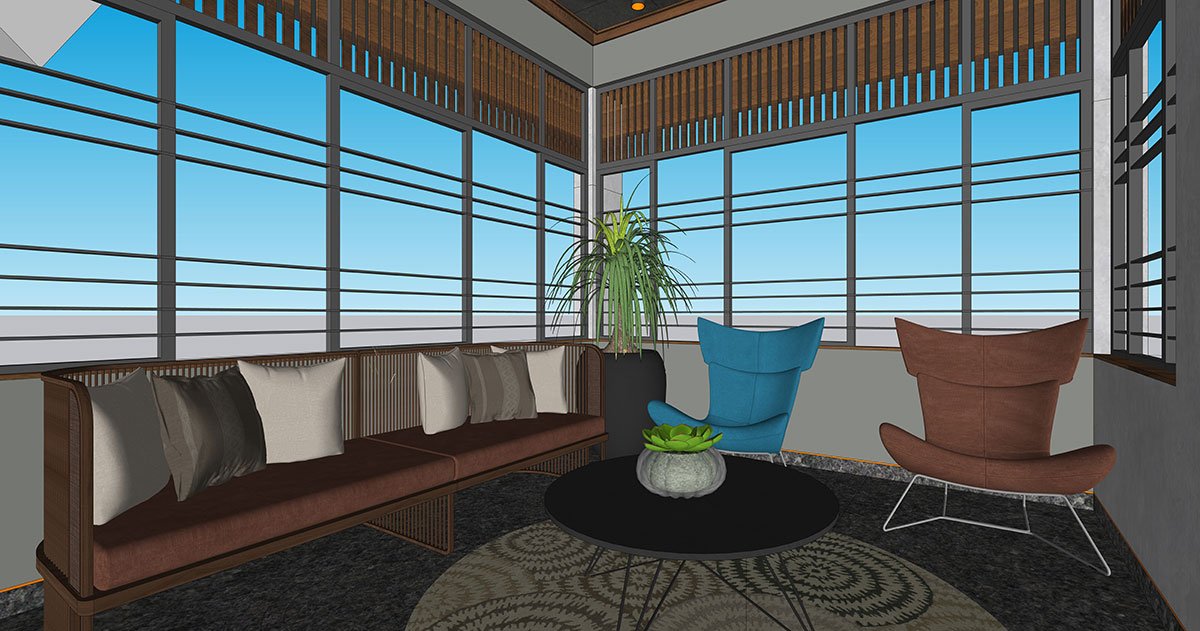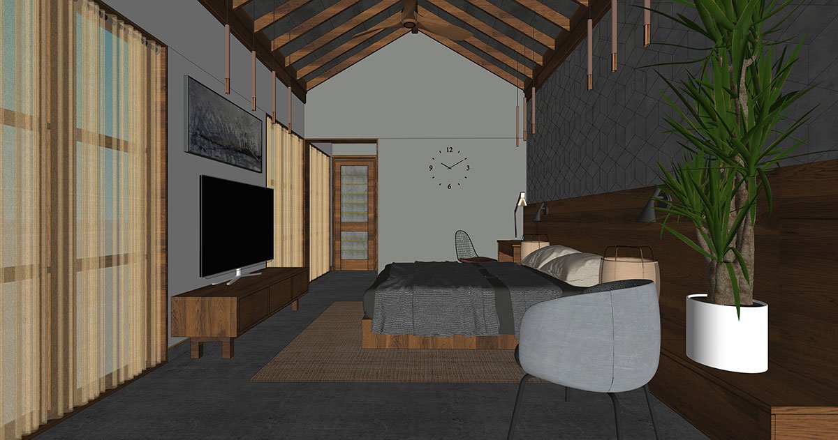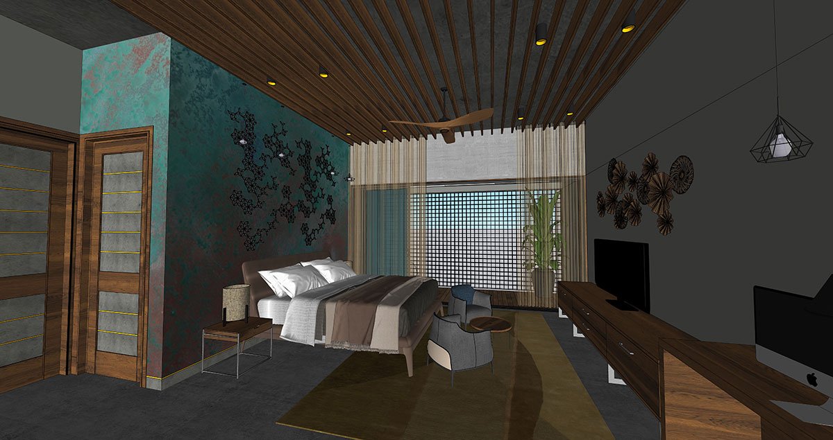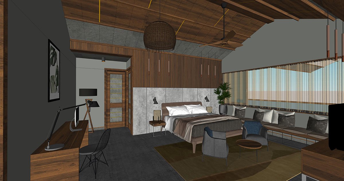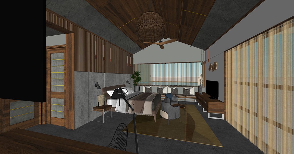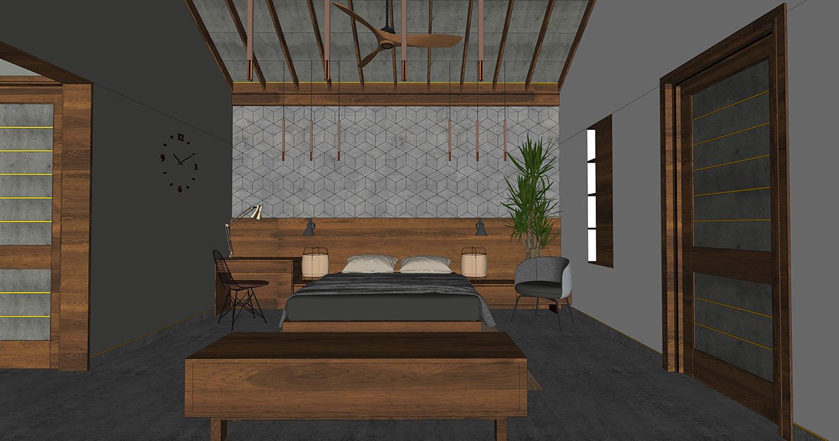 The moment you enter the subtly framed gateway, the longitudinal monumentality of the handsome rustic exterior, etched in grey stone veneer and Sri Lankan mud plaster, strikes a chord of minimalism at its core. The jutted-out balcony, fanned-out car porch and projected- out fins enrich the contemporary Kerala-style architecture along with minimalistic mullions and a gabled roof. The climate-sensitive architectural style of Sidra entwines green foliage in every province, hemming the spaces with a dramatic quality.