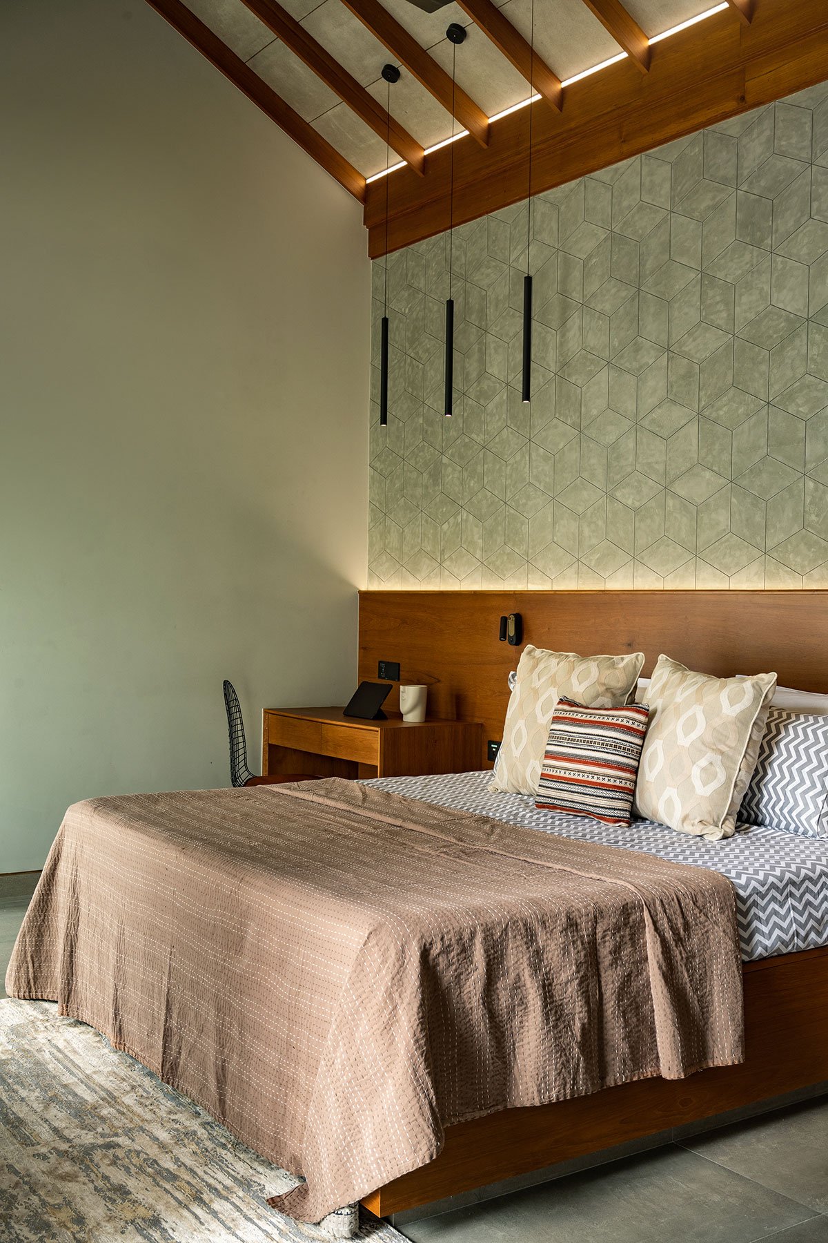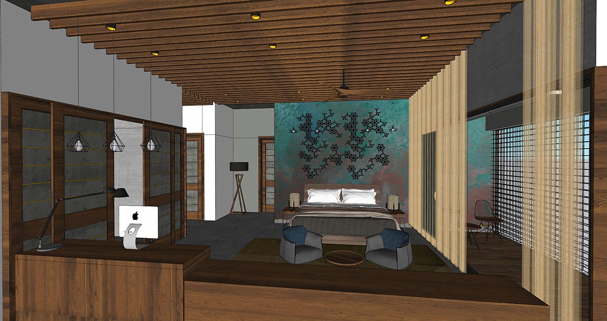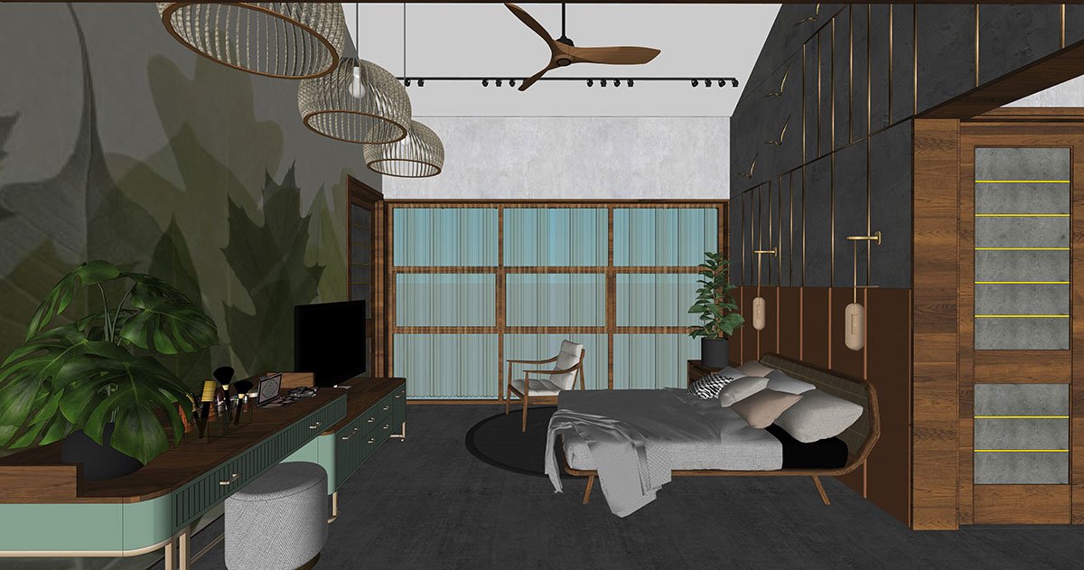 Each bedroom with walk-ins, work desks and ensuite bathrooms follows a distinct theme with mood lighting, exhibiting a signature glam. Tucked alongside the dining is a compact bedroom with elementary wood finishes and a hexagon-patterned feature wall. On the other side of the stairway is a ladies living lounge with a personal courtyard. An ell beyond is the luxurious master suite, accessed via a slim foyer into a spacious and comfy bed space. Artfully modern with beige drapery, leaf motifs and lean wooden beams, the bedroom accommodates exceptional walk-ins for his and her and a premier bathroom. The bedroom extends to an outdoor deck that beckons you to come out and sit with the surrounding nature.