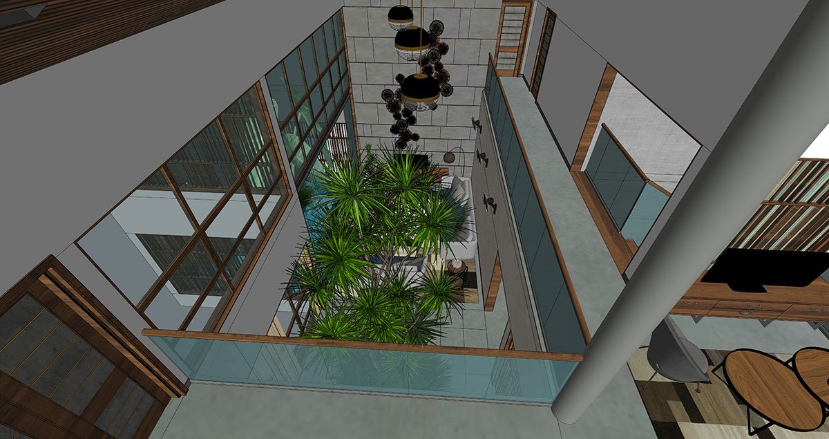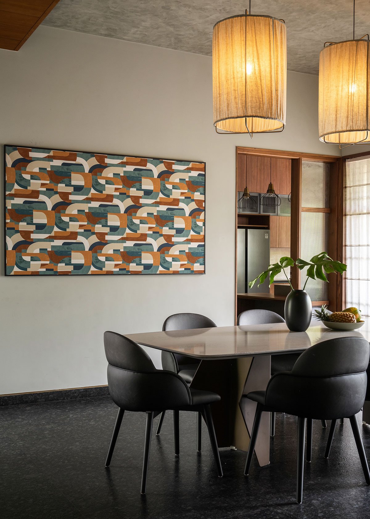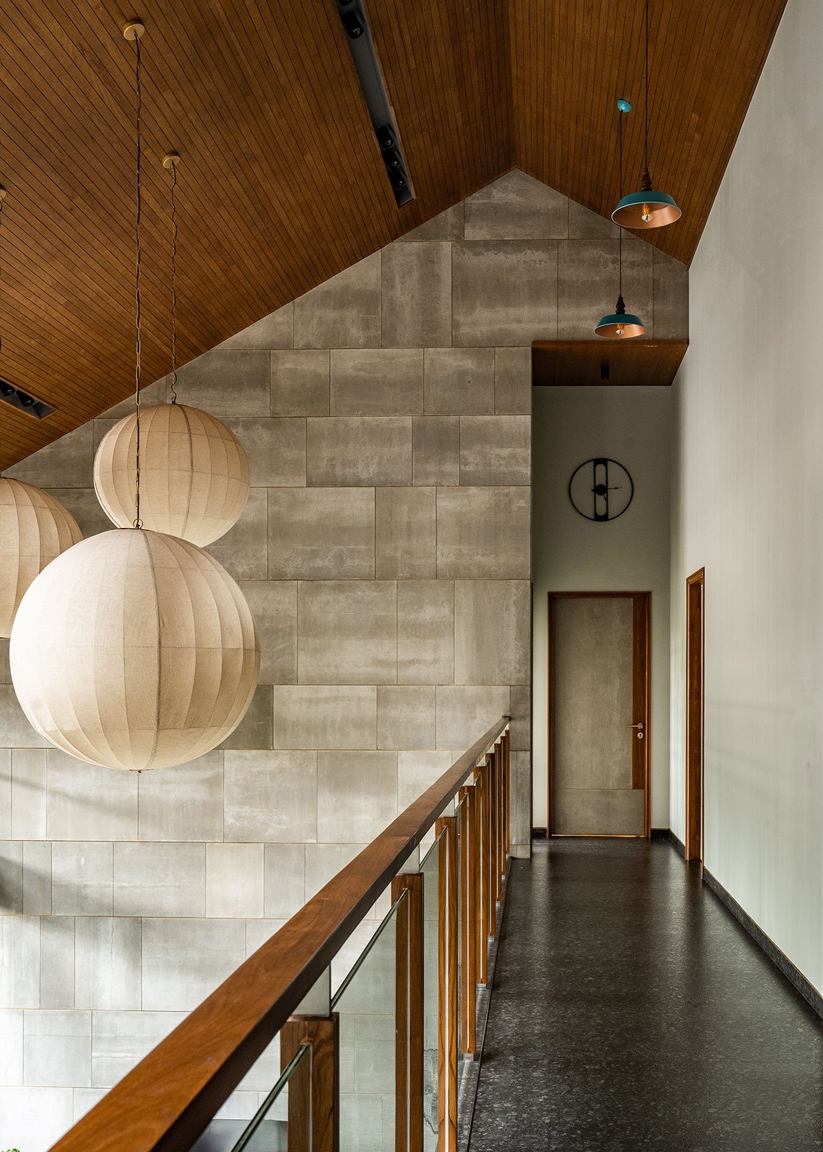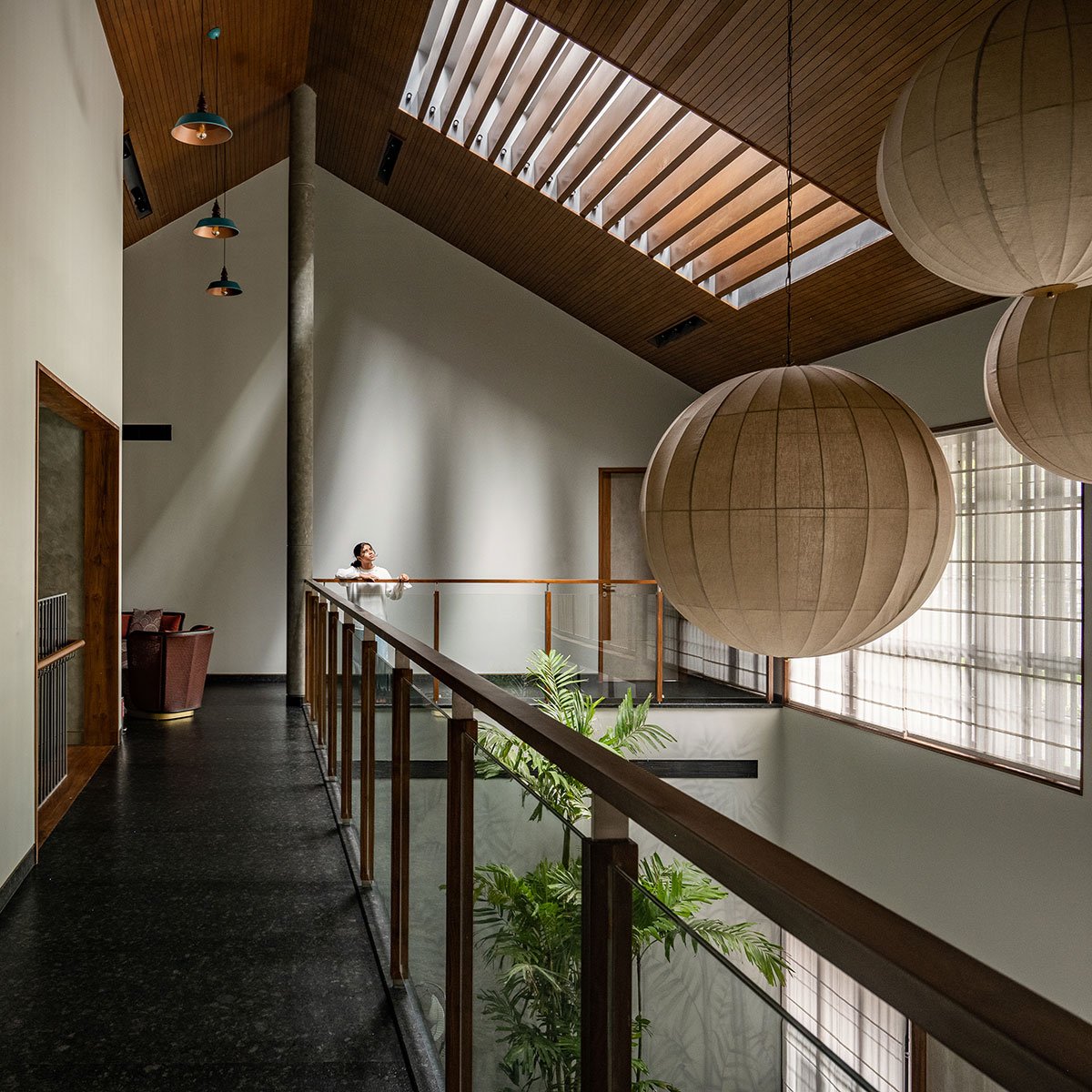 As evocative as it is functional, a pergola-style skylight splashes natural light into the volume and suspended bulbous lanterns on the wooden ceiling warm up a cosy ambience. Sleek geometric glass frames slide open to a semi-shaded raised water court that casts an alluring aura and acts as a passive cooling feature.