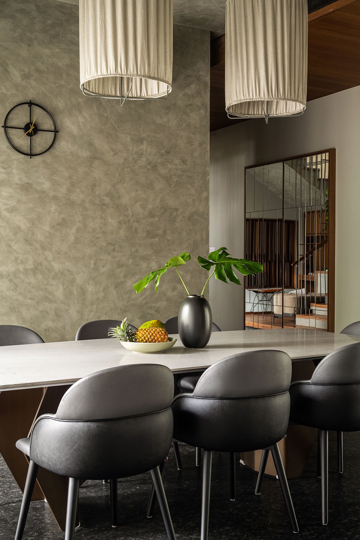 The living room leads to a staircase crafted with thin rails and wooden treads on a concrete finish. A nook below the stairs becomes a perfect work desk, an ode to the careful curation of nulling negative spaces in the home. From here, the ground floor widens as two wings. A well-portioned, delectable dining, cheered by ample light through full-length windows, abuts the northern wing, with a wash and a powder room in-between.