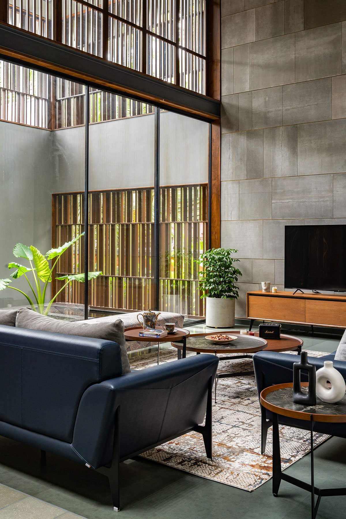 A ‘poomukham’ (verandah) and a water court on either side of the front sit-out unveil an inviting sequential entry, offering a sneak peek through lattice screens. A large wooden door with thin timber slats opens into an A-framed double-height interior space. Graced by green foliage, the space linearly extends into an expansive, gorgeous grey living room.