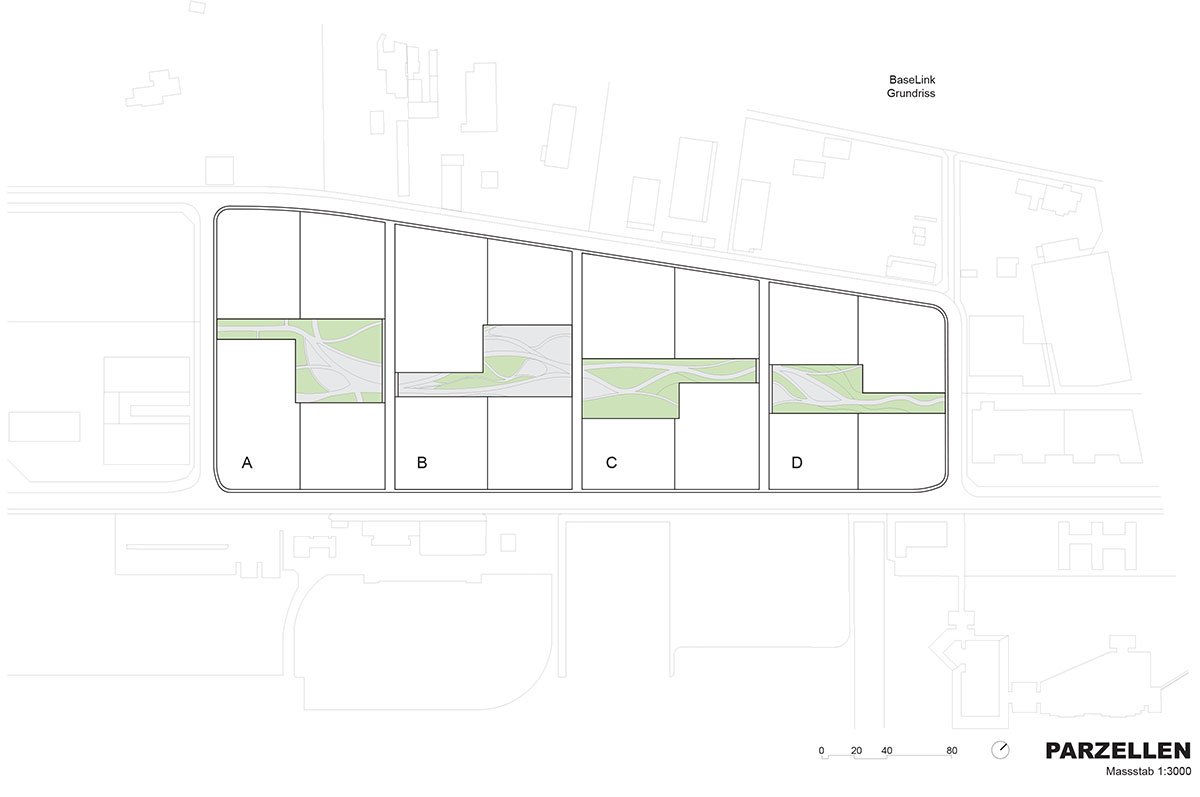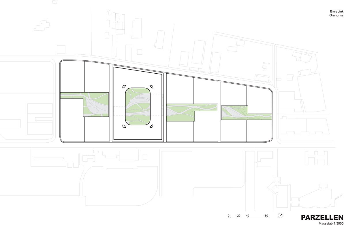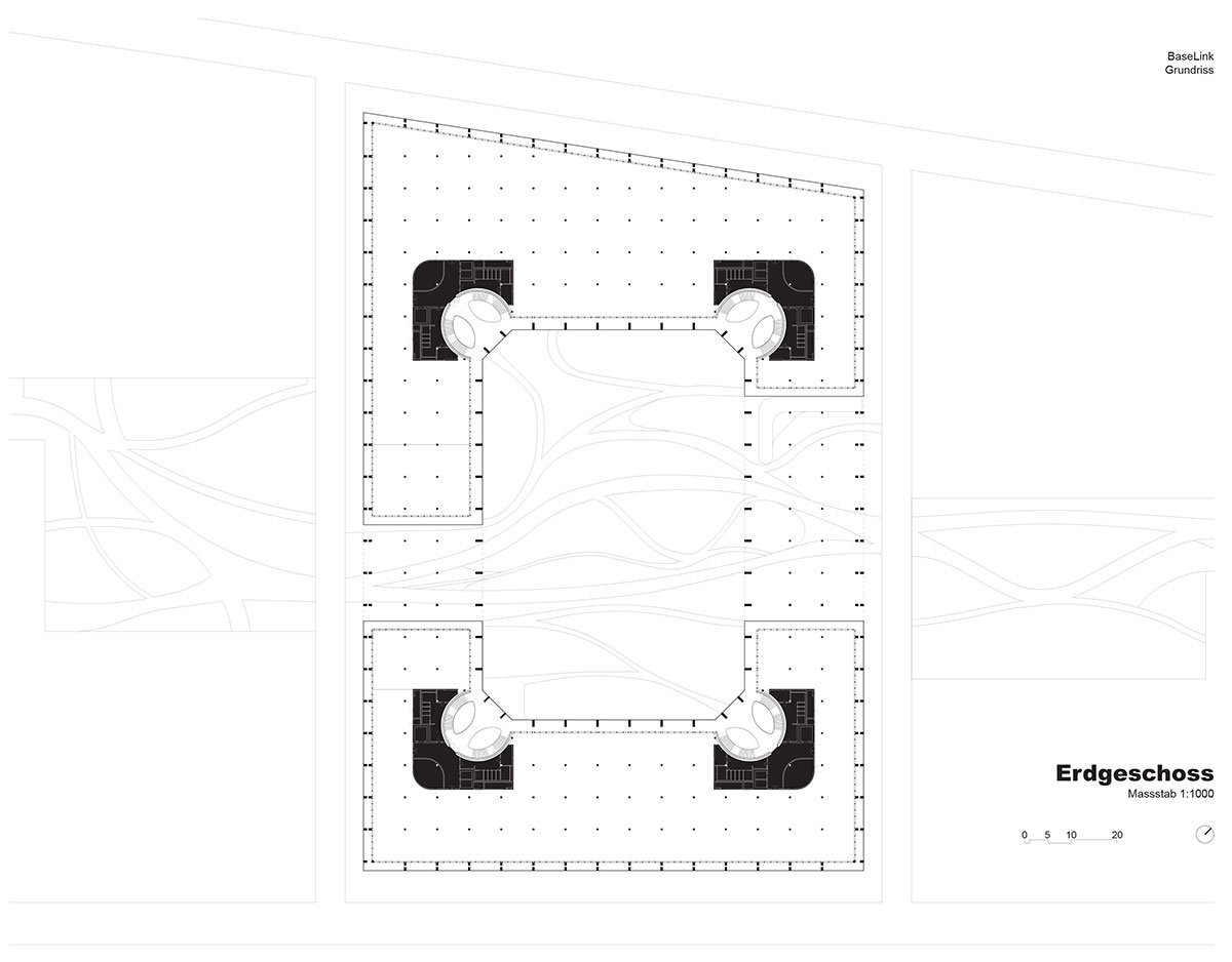 Based on the concept of a ‘courtyard house’, the SIP Main Campus offers approx. 50,000 m² of usable floor area for 2500-3000 employees and thus is the largest building on the site. The landscaped courtyard is accessible through a pair of two-storey passages that cut through the block at street level. It is one of a sequence of green spaces running from west to east through the entire BaseLink site, contributing to a good microclimate and allowing connections from one property to the next.