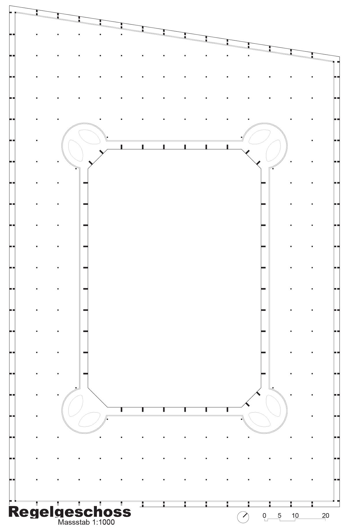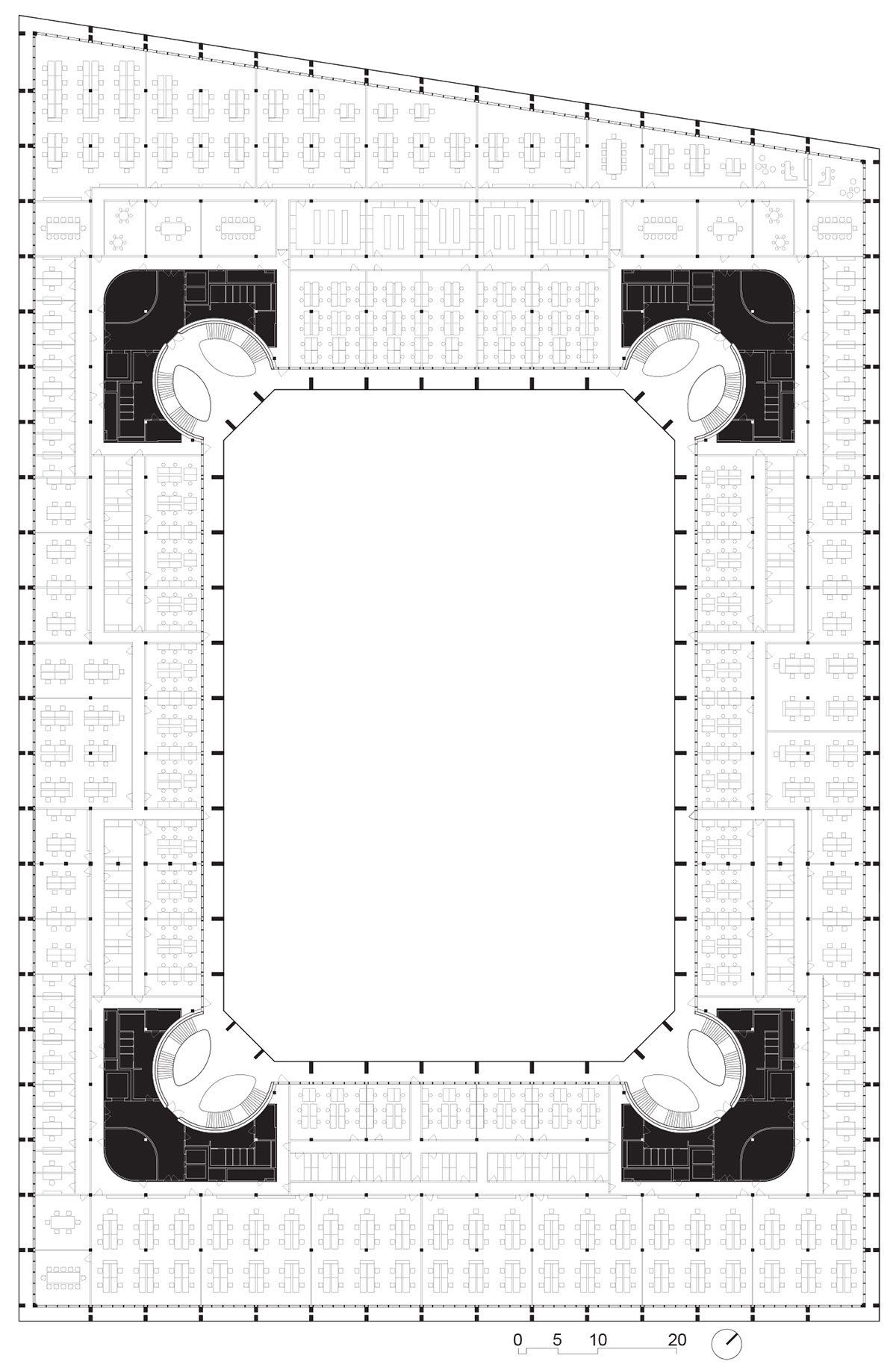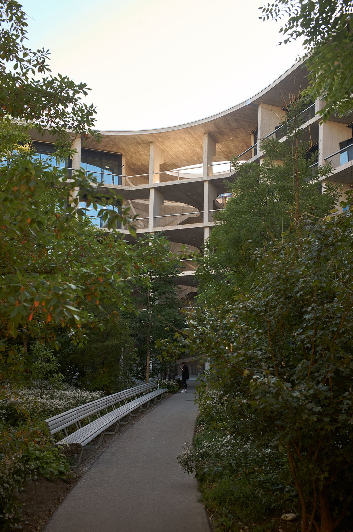 The shaded central recreation area – as large as a football field – is designed with a combination of trees and deep-bed planting, leaving the visual axis at eye level free for easy orientation; climbing plants extend the landscape vertically to the pillars of the building itself. The groundscape consists of largely unsealed gravel surfaces and seepage pits in reference to the original riverbed landscape of the area. From the inner courtyard, the building is accessed via four generously designed spiral staircases in the corners, allowing for up to eight different main users per floor.