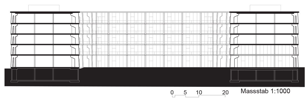 The facade is defined by a deep, gridlike structure of in situ concrete, which absorbs vertical loads and serves as bracing for wind and potential earthquakes. These inner and outer rings of structure allow for a reduction of size and number of structural elements inside the building, which in turn offers the greatest possible typological and scale flexibility for users.