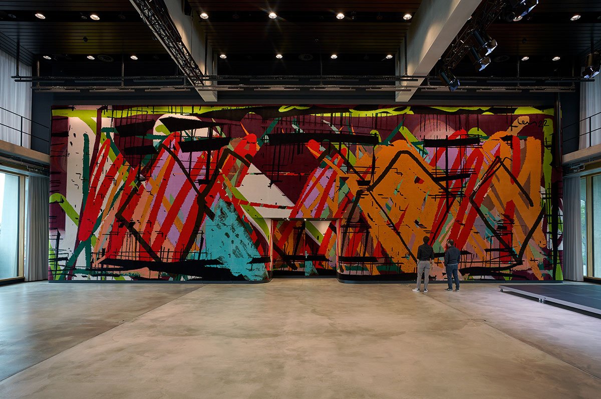 An interlaced grid of fluid lines of white plaster gives a specific character to each of the four corner stairs; the large gestures of the lines both accompany and anticipate the movement of collaborators between the floors. A custom-made wool tapestry, Nina, 19 x 7.5 meters, is installed on the wall of the auditorium; complementing the monochrome simplicity of the artworks in the stairs, it integrates their expressive lines with a vibrant, colorful pattern.