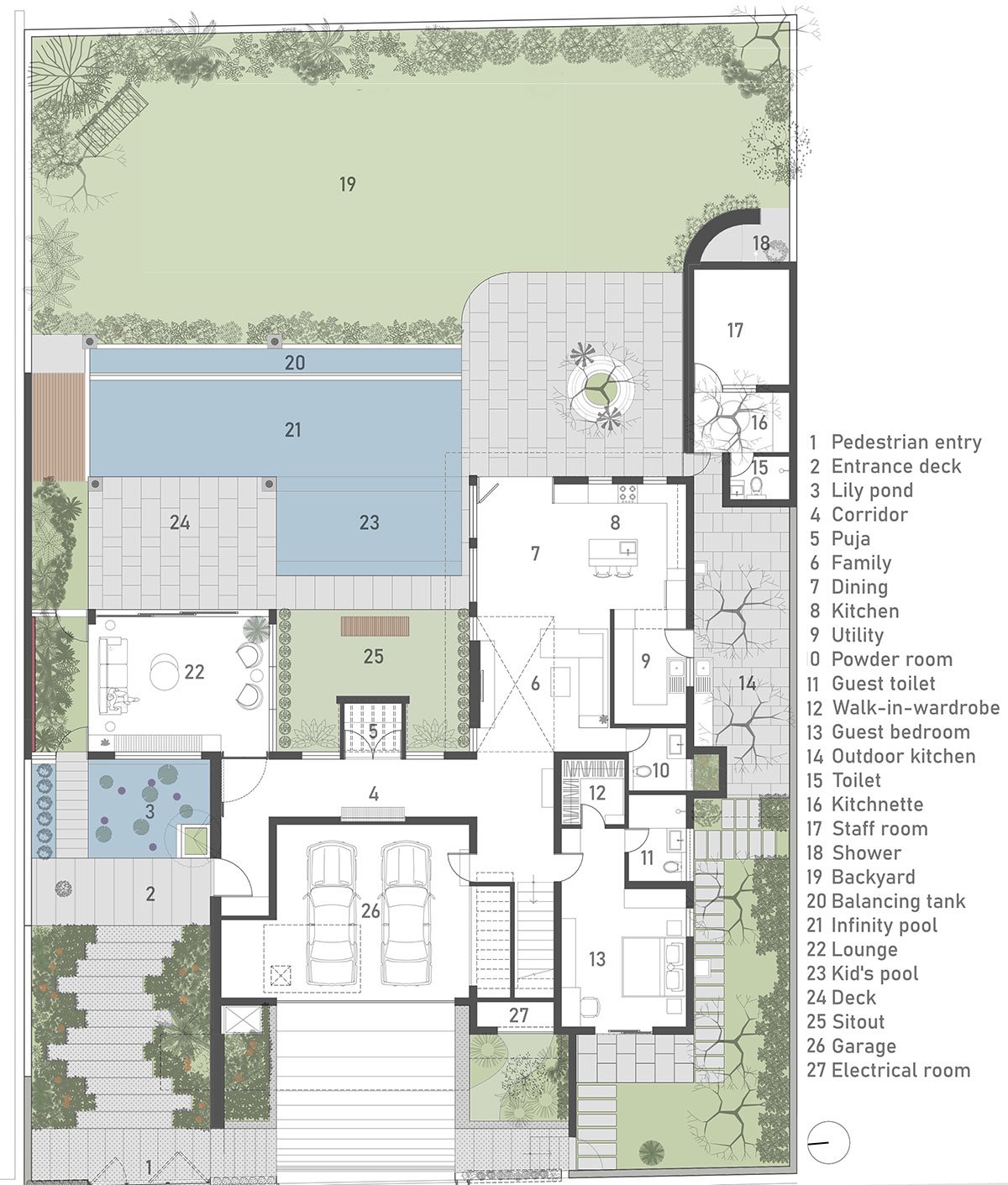 An introverted planning approach was taken and the built spaces were lined up towards the front of the plot while the large garden, which was the point of focus, and the infinity pool was placed towards the back. The open plan, which was guided by the principles of Vastu, ensures that the living, dining, and kitchen areas flow seamlessly into one another, The entrance is a series of floating steps which follows the natural terrain of the land and ends in an entrance platform alongside a lily pond. Flanking these steps and the landscaped entrance porch are existing coconut trees. The formal and informal areas of the house, though visually connected, are distinctly separated and placed at the opposite ends of a central corridor which also has the puja room.