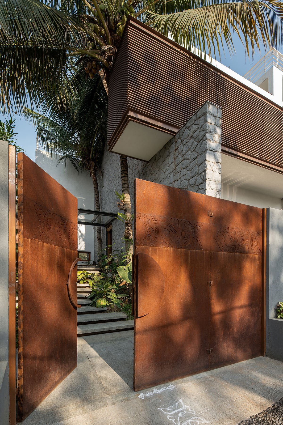 Excerpt: Siri, a residence by Design Kacheri, celebrates and integrates with the existing landscape while offering a luxurious, sustainable living experience. Positioned to optimize natural light and ventilation with minimal impact on trees, the design features introverted planning with expansive verandas, decks, and terraces that extend indoor living outdoors. Lush tropical gardens around the house provide a private and tranquil atmosphere.
