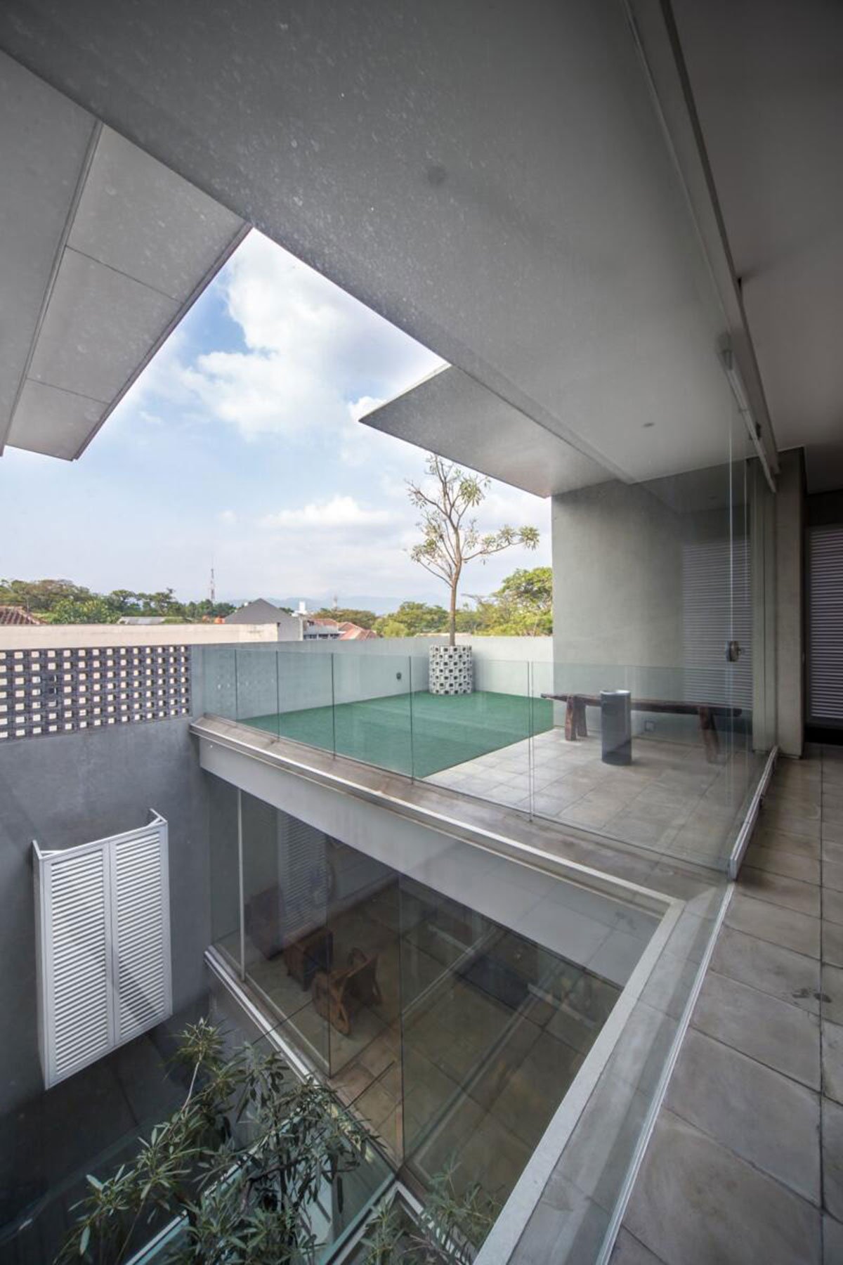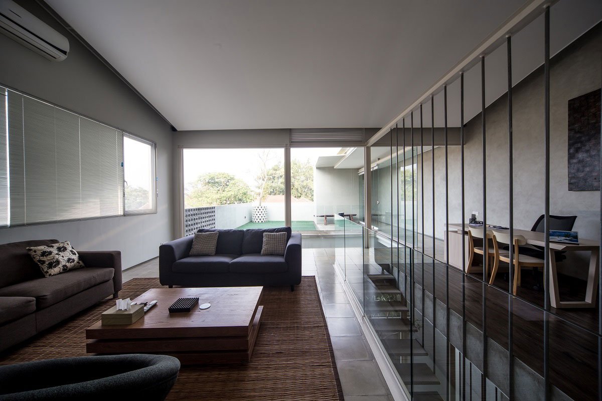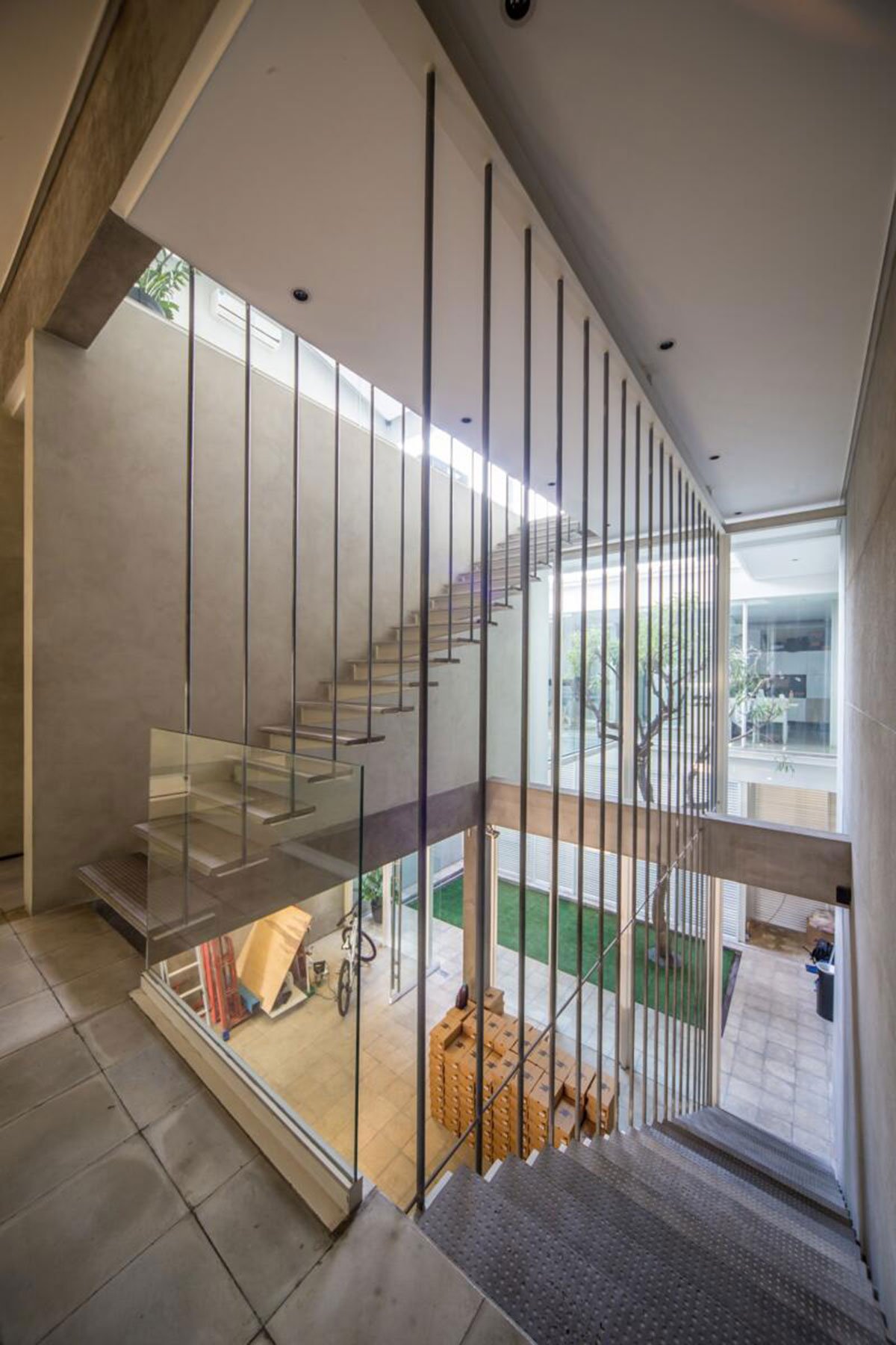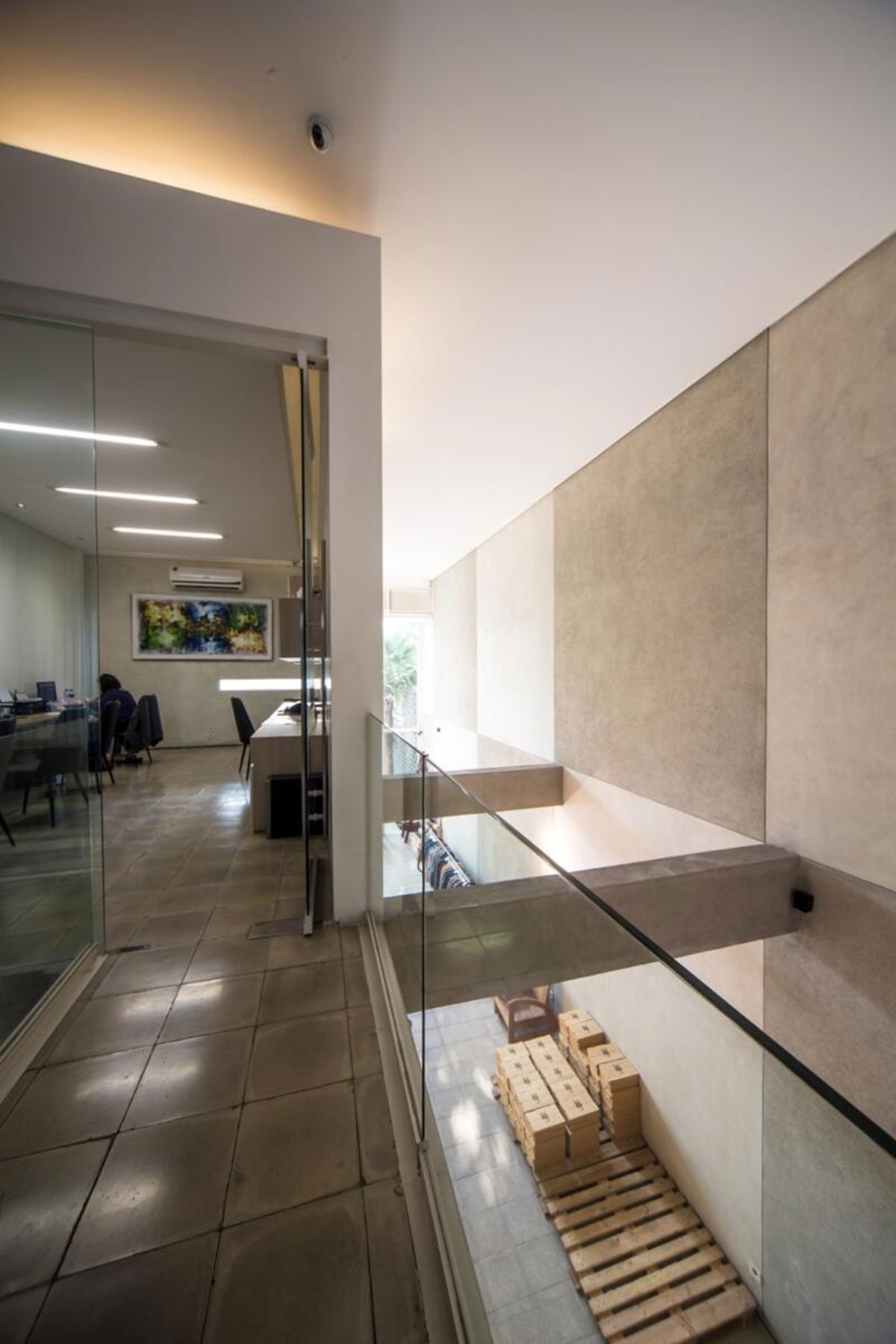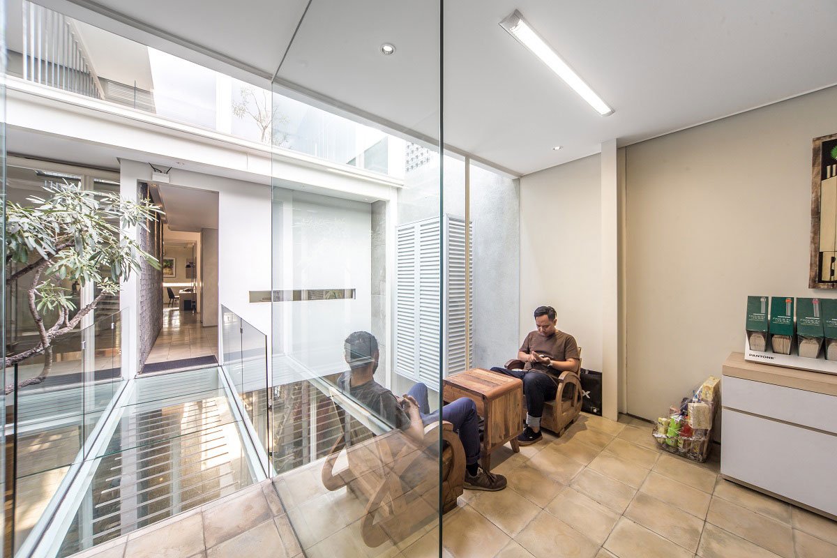 The circulation bridge that connects the two boxes at the upper level and the light steel -concrete stairs with iron tube railing are made obvious from any spot of the building to show coexistence between the retail space below and the working space above. The bridge that punches through the meeting box above goes crossing the inner garden to the back building block with transparent glass floor and railing minimizing solid expression around the precious tree. The existing attic transformed into a living room for the board of directors that also connected to a garden on the roof of the back building block. This garden feels connected to the lower one by the tall tree below that reaches up to the top floor.