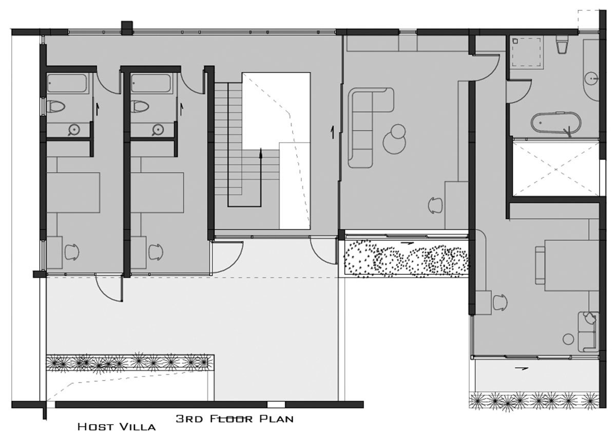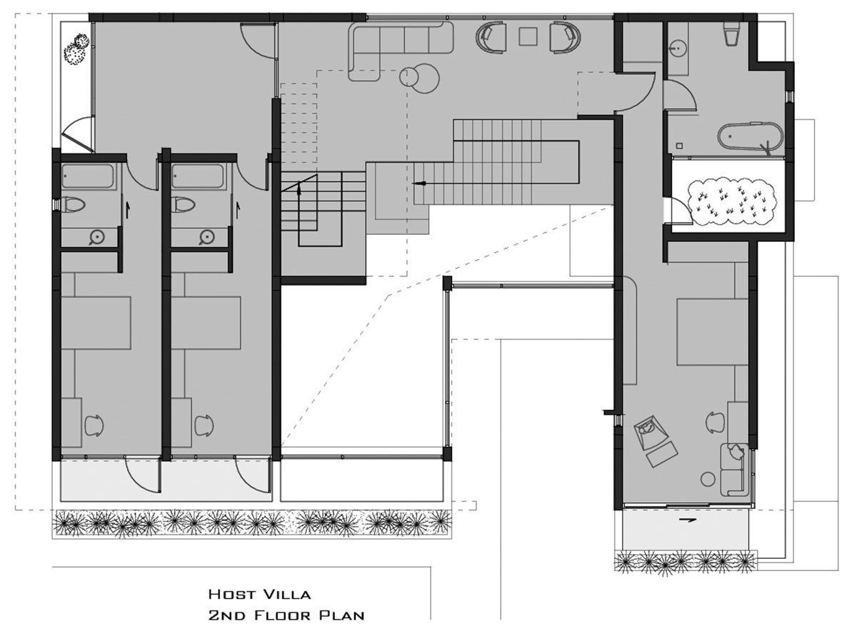 The border of the water garden is irregular, providing varied surrounding façades, like Master of the Nets Garden. Walkways and corridors around water give the experience of promenade, repose and viewing. A pavilion is formed at the joint point of two corridors, floating lightly above the water, hiding the villa building in the north behind its back. The first floor of the east volume is a little art gallery, also used as a handcraft atelier, whose glass façade brings in the landscape of the orchard-field on the east of the site, gaining visual depth for the whole garden. Eight guestrooms are set on the second and third floor, viewing the orchard-field.