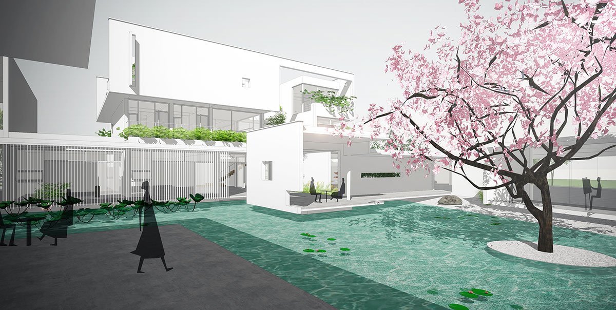 The site is surrounded by a river in the north, a town road in the west and an orchard-field in the east. The adjacent industrial site in the south needs to be obstructed by a high wall. The main entrance is situated on the north side, a bridge crossing the river, which is similar to Canglang Pavilion Garden. A linear glass volume beside the entrance is overhung above the river, which is light and transparent. People sitting and drinking tea therein, watch the landscape that permeates mutually between the garden and the river. Meanwhile, the riverbank can be also used as public landscape space for the native residents. Retail and displaying spaces are placed by street-side in the west.