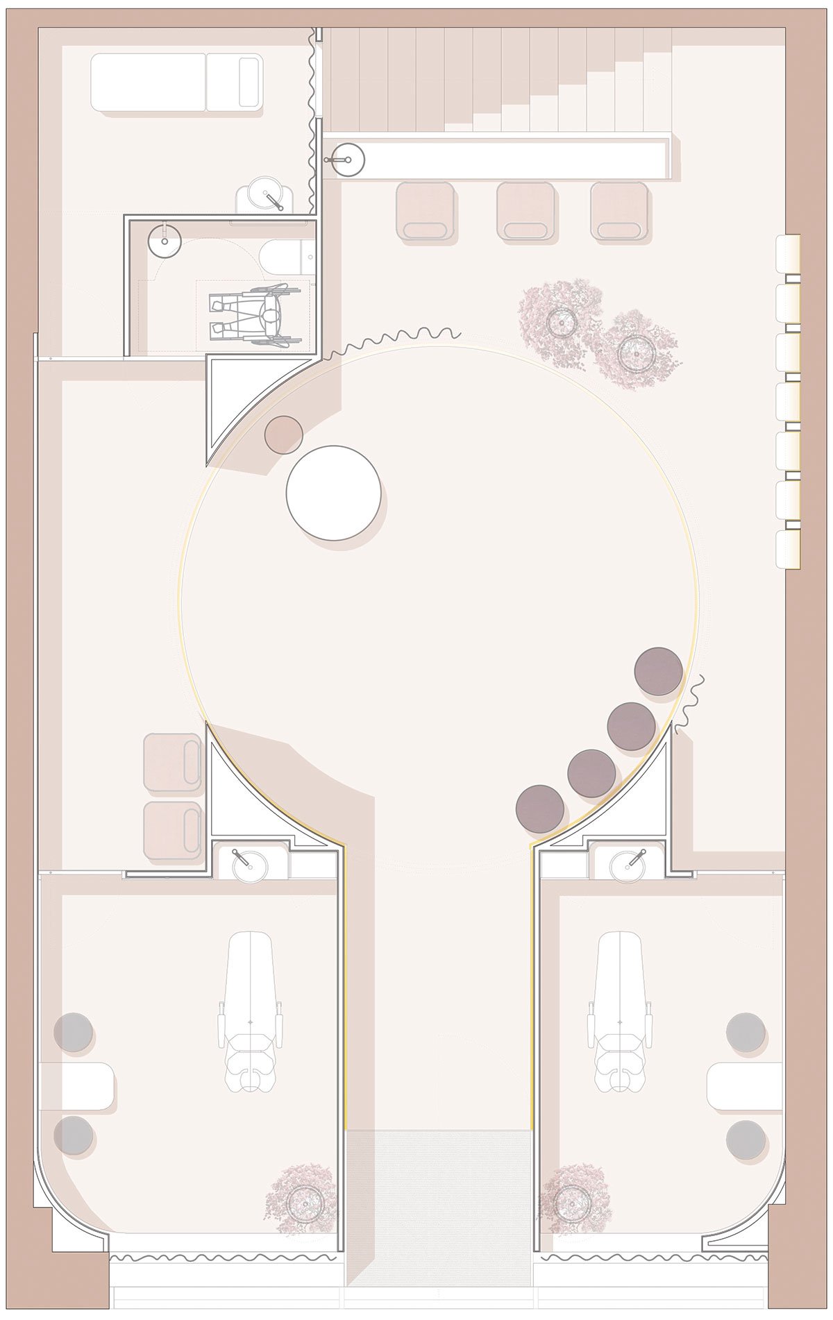 In order to guarantee natural light for the medical offices, they were located on the sides of the facade. The location of these two offices defines a corridor that culminates in a central circular hall where the reception is located. This multifunctional central space is characterized by a large, vaulted ceiling that merges with the walls, setting the tone for the aesthetics of the space.
