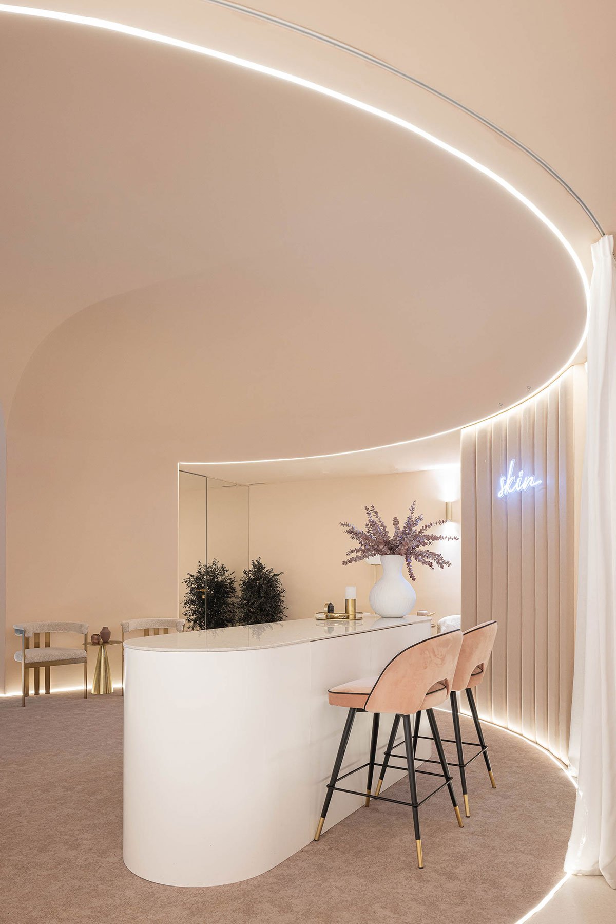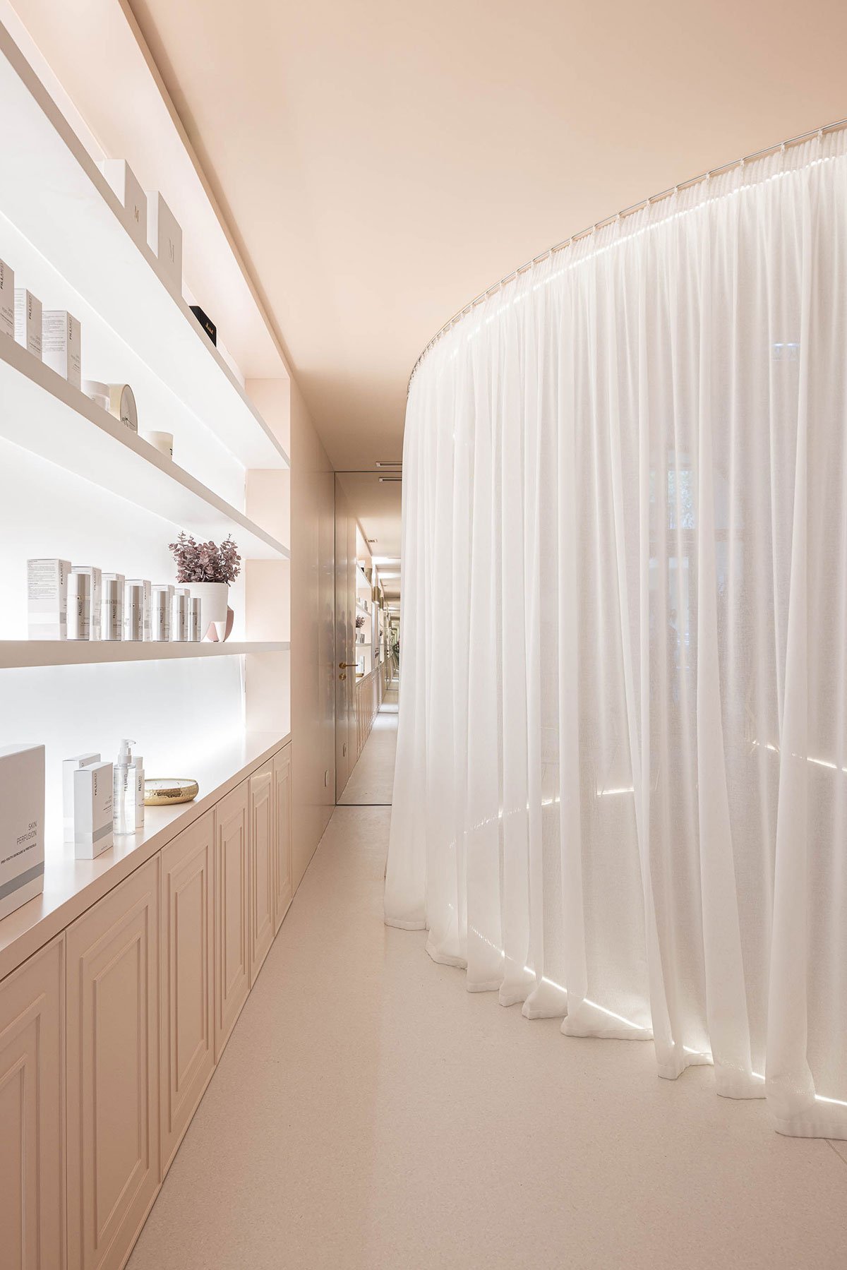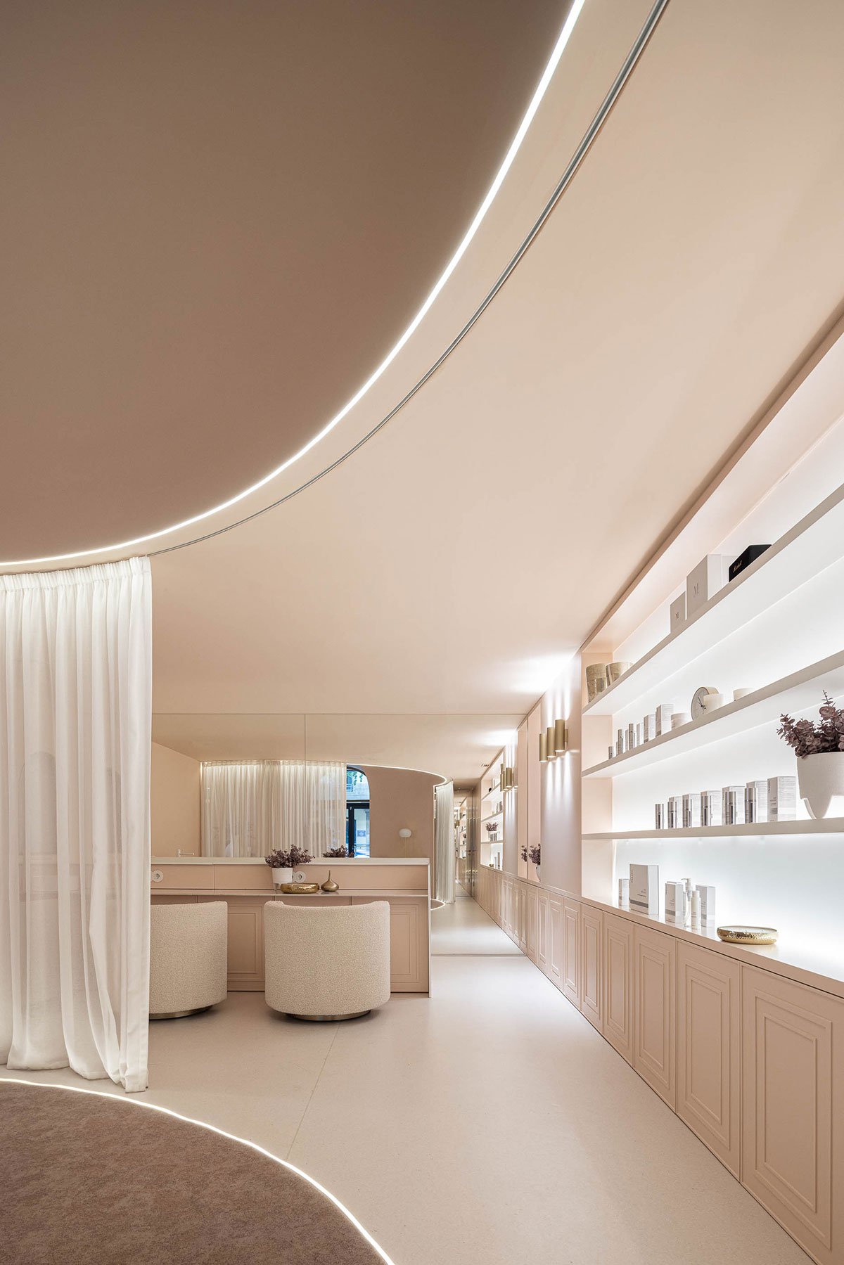 Excerpt: Skin Boutique, designed by Paulo Merlini Architects, is a two-storey beauty clinic located on the ground floor of a residential building. The interior design draws inspiration from the human body, featuring organic shapes and a dry pink color scheme. The space is organized symmetrically to optimize natural light. A reception area with a large, vaulted ceiling that merges with the walls defines the clinic’s overall aesthetic.