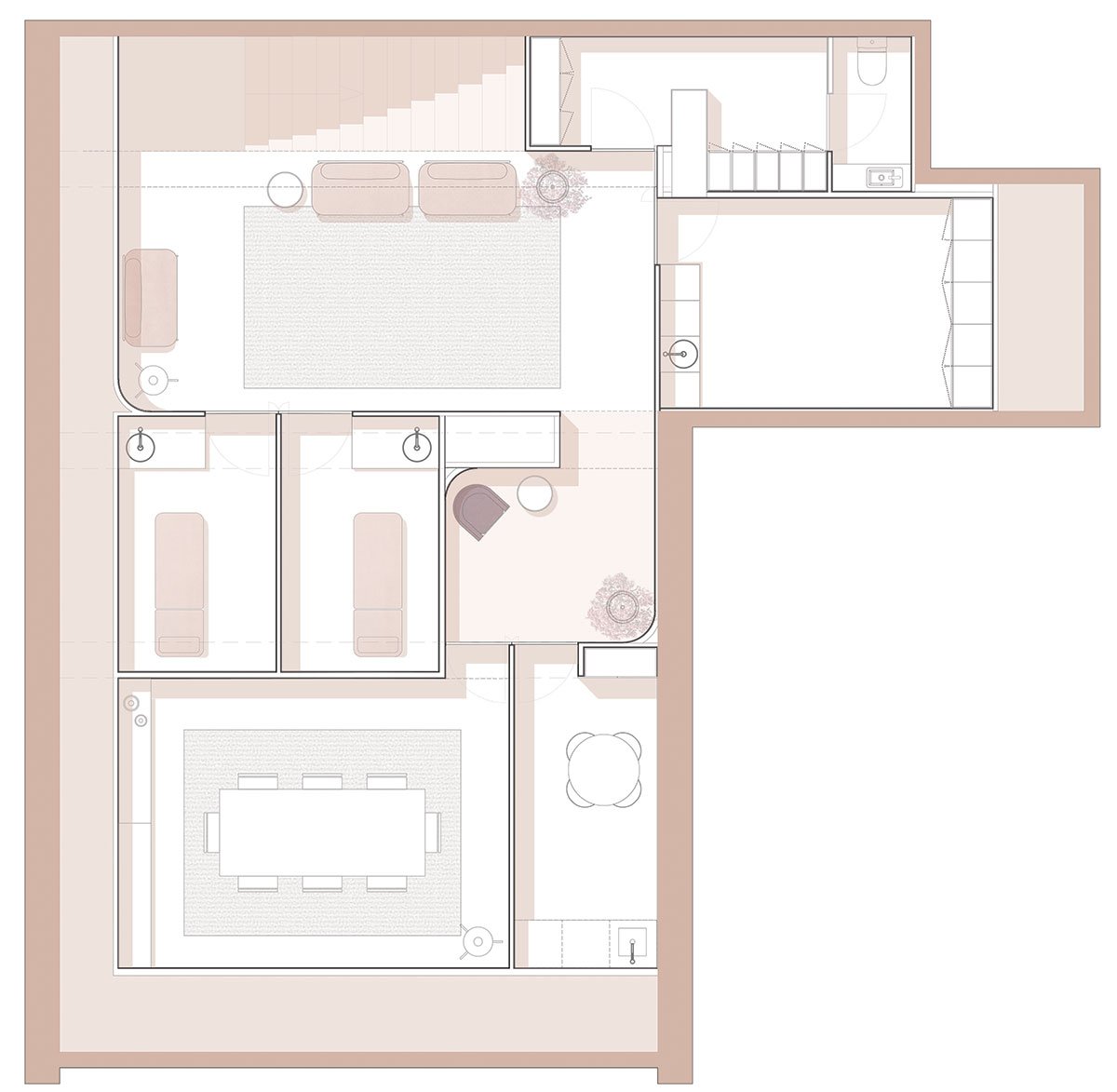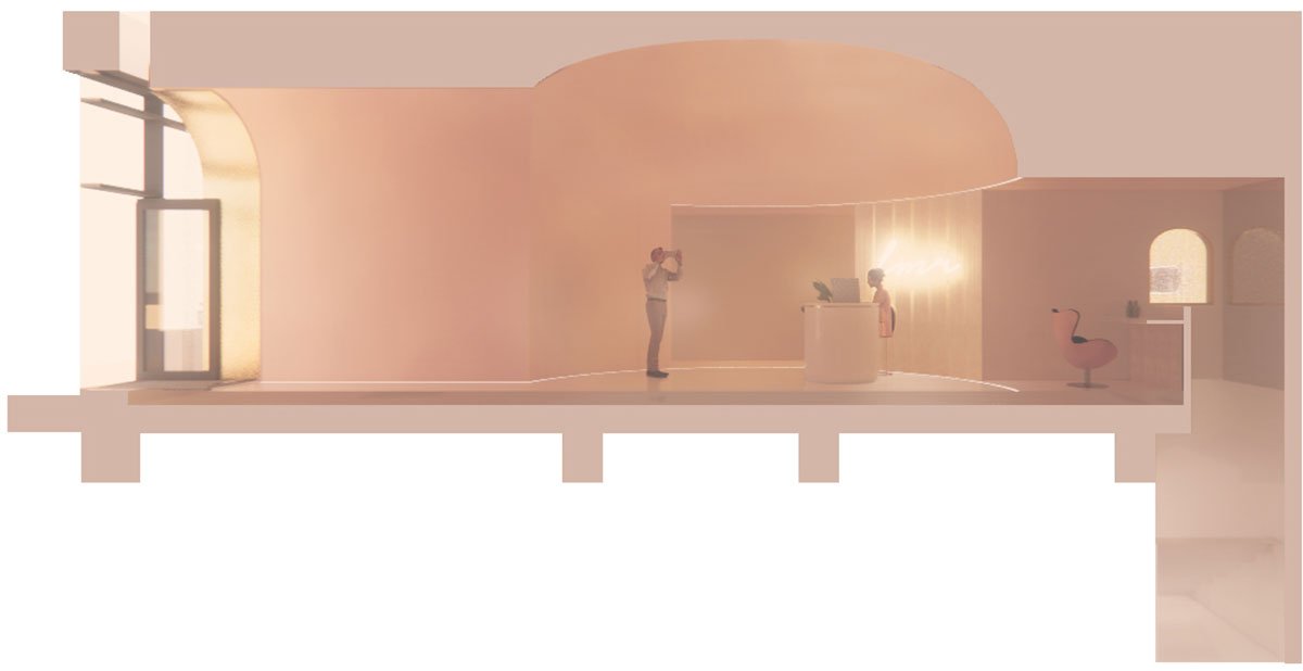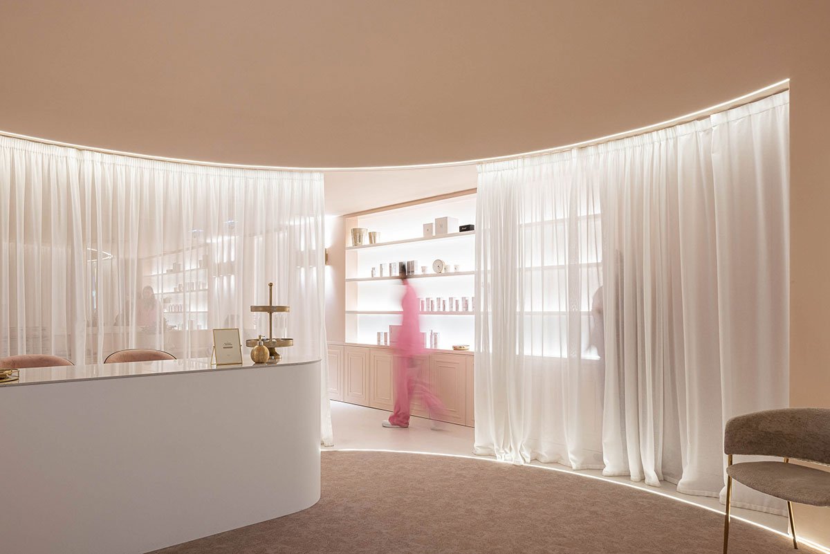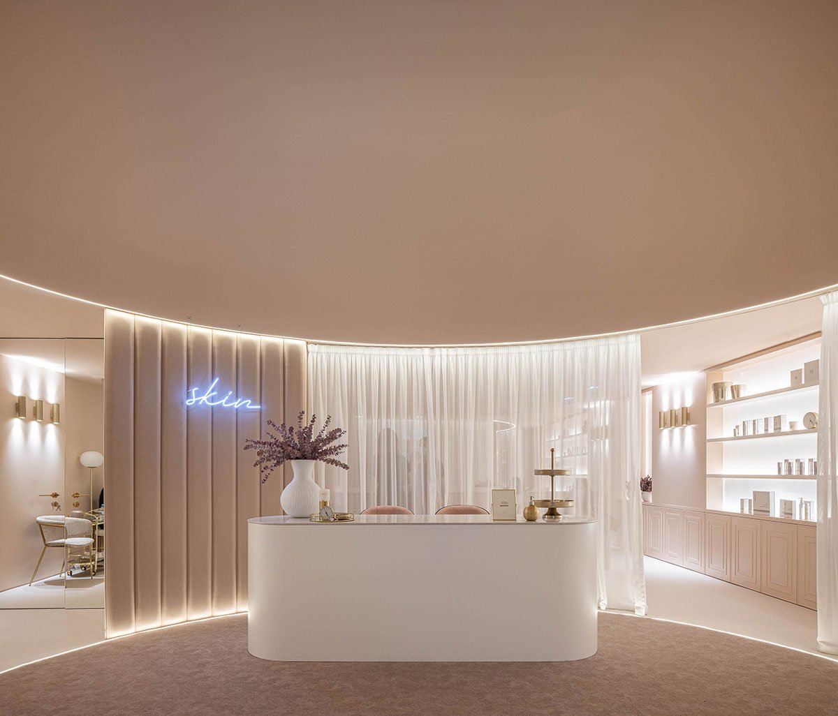 Excerpt: Skin Boutique, designed by Paulo Merlini Architects, is a two-storey beauty clinic located on the ground floor of a residential building. The interior design draws inspiration from the human body, featuring organic shapes and a dry pink color scheme. The space is organized symmetrically to optimize natural light. A reception area with a large, vaulted ceiling that merges with the walls defines the clinic’s overall aesthetic.