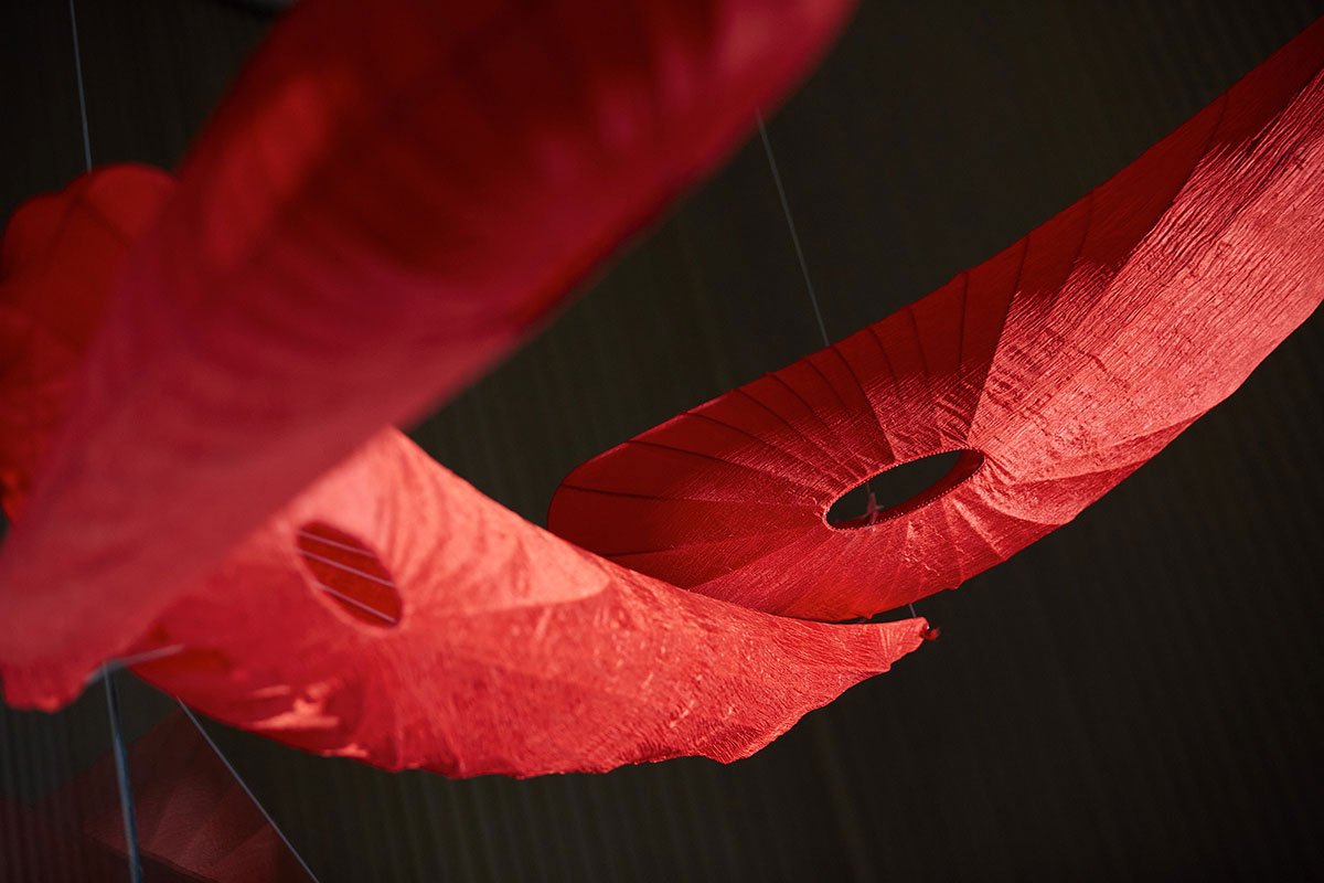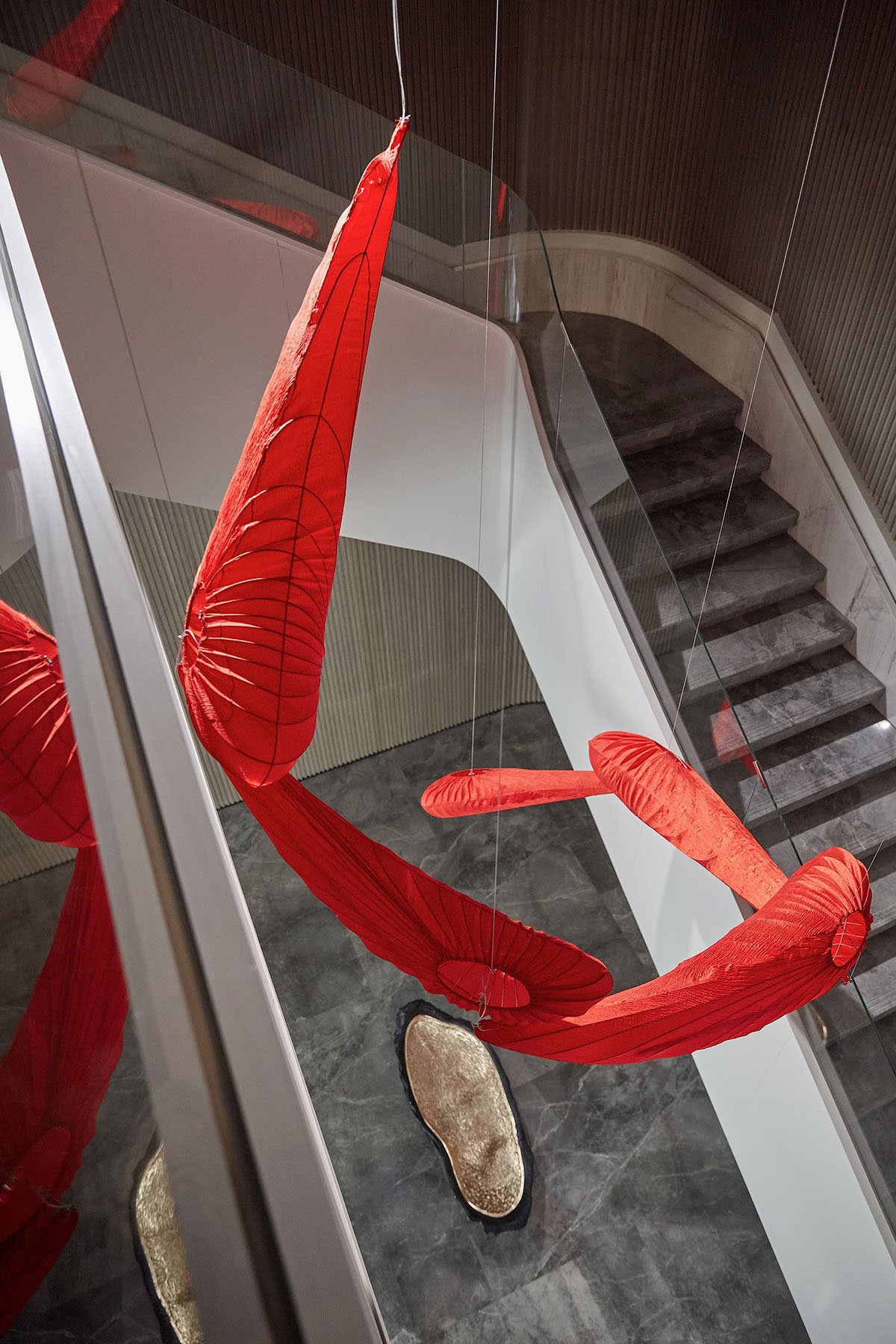 The suspended metal lighting fixture sparkles, implying the long history of local imperial brick kilns. Complemented by lighting, the red “oars” appear more gorgeous. Art installations echo the suspended “oars”, together breaking the serenity of the space through hues and forms and forming a playful abstract painting. Past and present, modernity and elegance, blanks and deconstruction, are merged here.