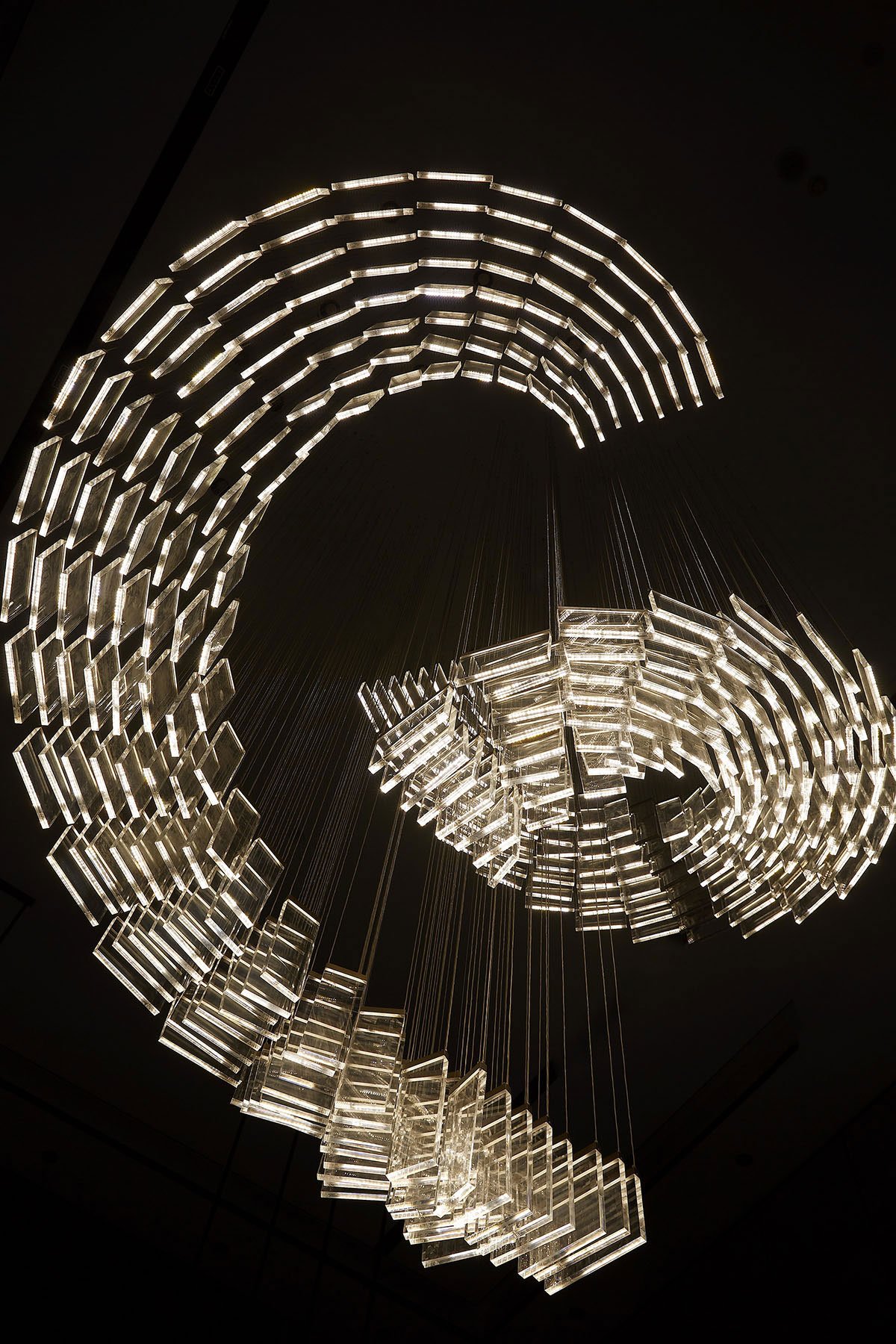 The project incorporates the understanding of art and life, and combines Oriental aesthetics with contemporary design languages, thereby forming a unique destination. The foyer presents a scene of touring garden by boat in an abstract manner. The grains of marbles spread out like ripples, and show the fusion of dark gray and beige hues, forming a poetic, elegant view that carries Jiangnan characteristics and Oriental sentiments. Above the property models area is an artistic lighting fixture, which extracts the layering of local traditional gray-tile eaves and also draws on the graceful lines of ships. It looks like a small boat floating in the air. The crystal material glitters, which creates a mist-like ethereal visual effect. The golden wall lamp injects a new rhythm into the space. Its water ripples-like form adds a calming atmosphere to the space, while also revealing a dynamic aesthetic.