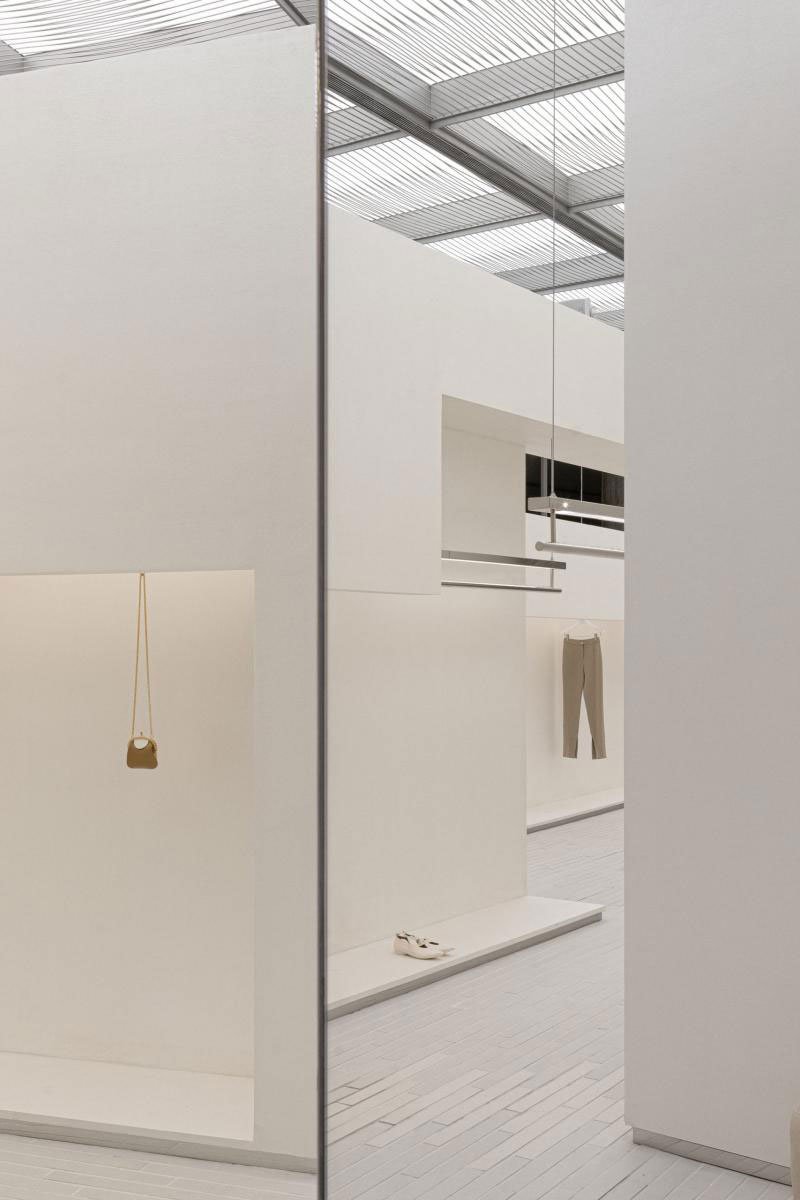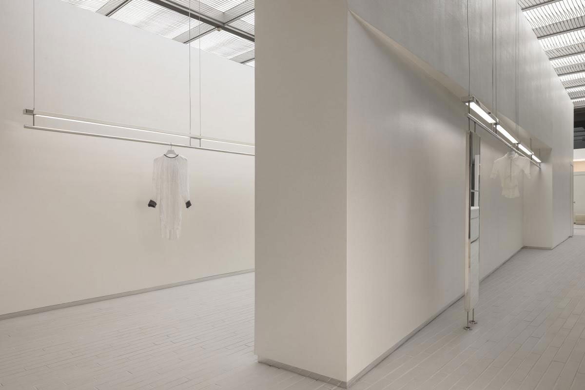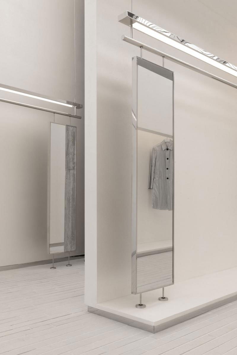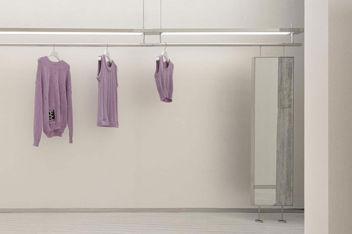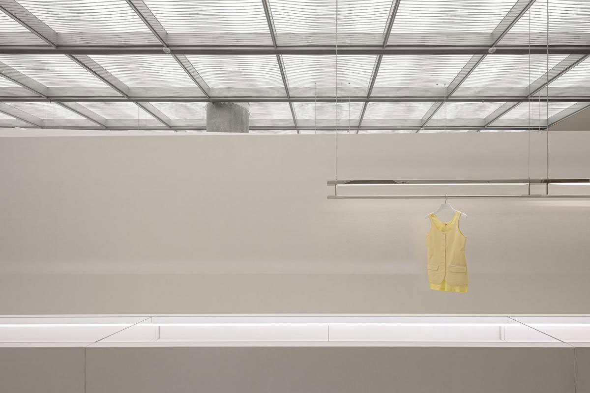 In this space, everything is expected to be ‘lightweight’, so that customers can only feel the space, garments and themselves when moving in it. The clothes rails, lamp boards and mirrors are suspended or floating in the air. All details reveal a coherent logic, giving the space an exquisite touch and a sense of layering.