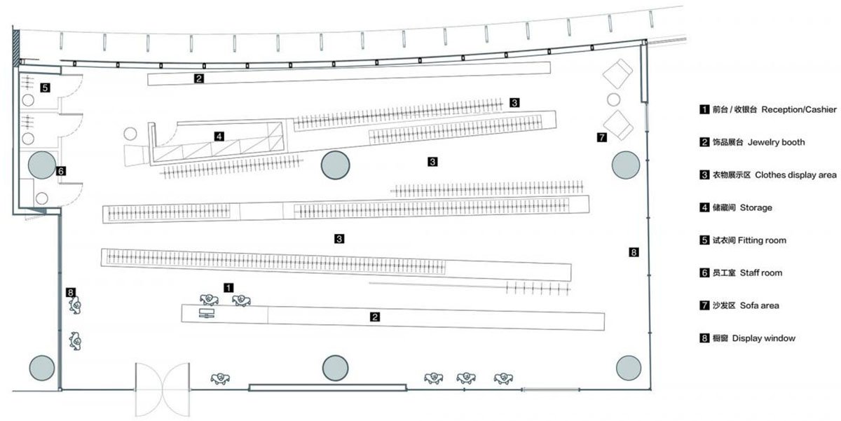The entrance area consists of a front desk and an area for clothes packaging, so that customers can be provided with timely services as entering and leaving the store.