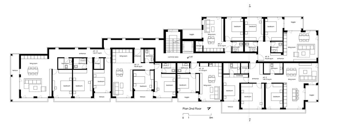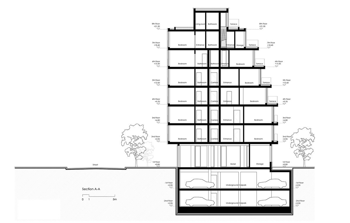 Functionally, the building is planned on two underground and eight above-ground floors. The first floor is intended entirely for commercial premises. There are apartments with a clear and clean layout and favourable geographical exposure from the second to the eighth floor.