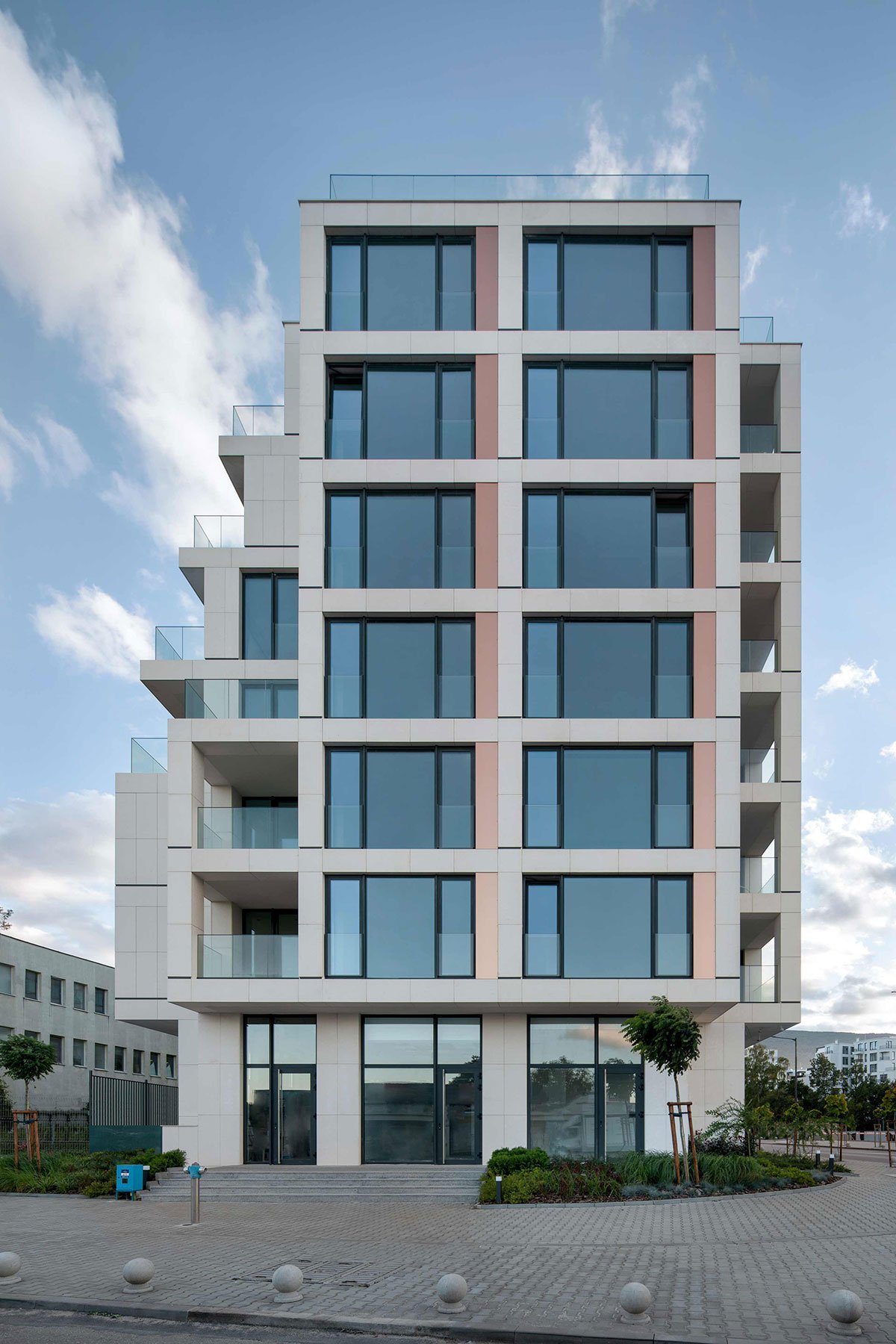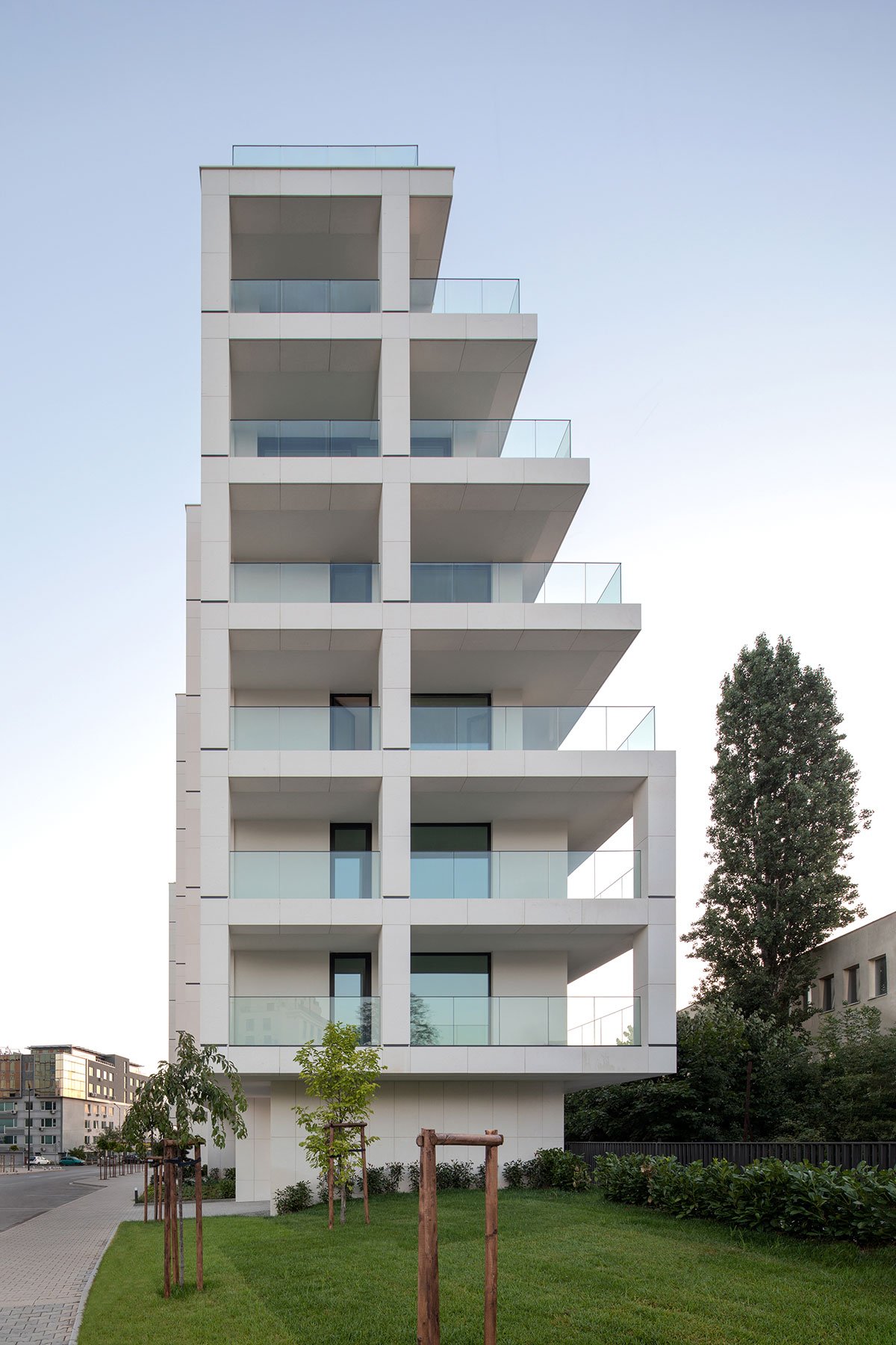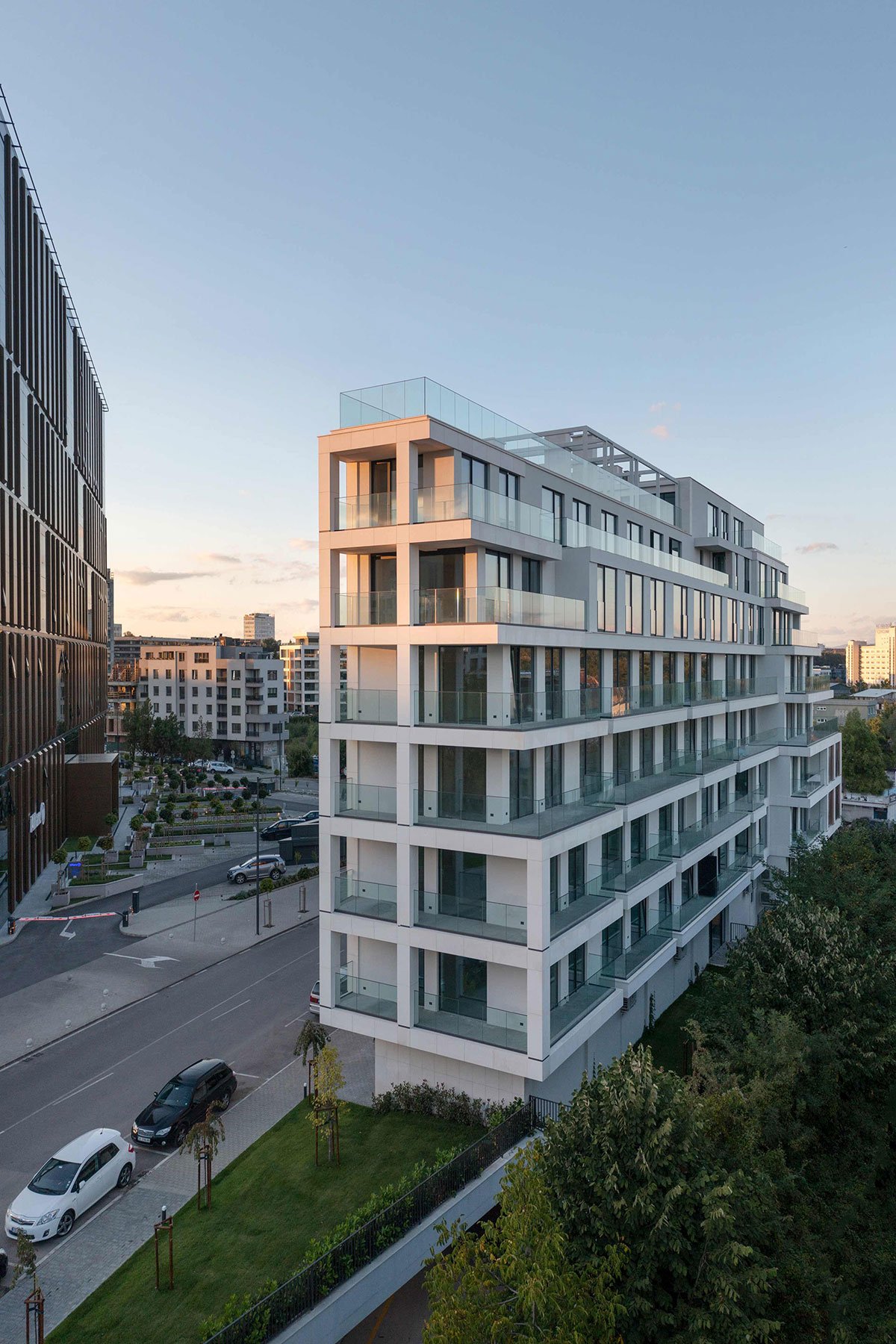 Excerpt: Srebarna 18, a residential building designed by STARH, has an external shell executed as a suspended ventilated façade. The main design element is a minimalist frame made of white limestone – Limra. Its square geometry calms down the dynamic volume and gives precision and order to the building. The materials and colours of the building complement and continue the context, dominated by the office buildings nearby.