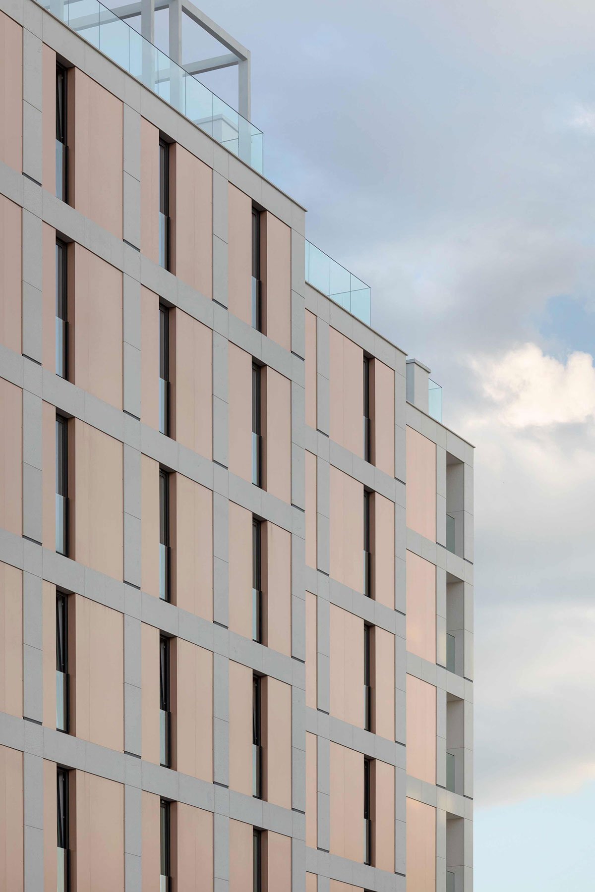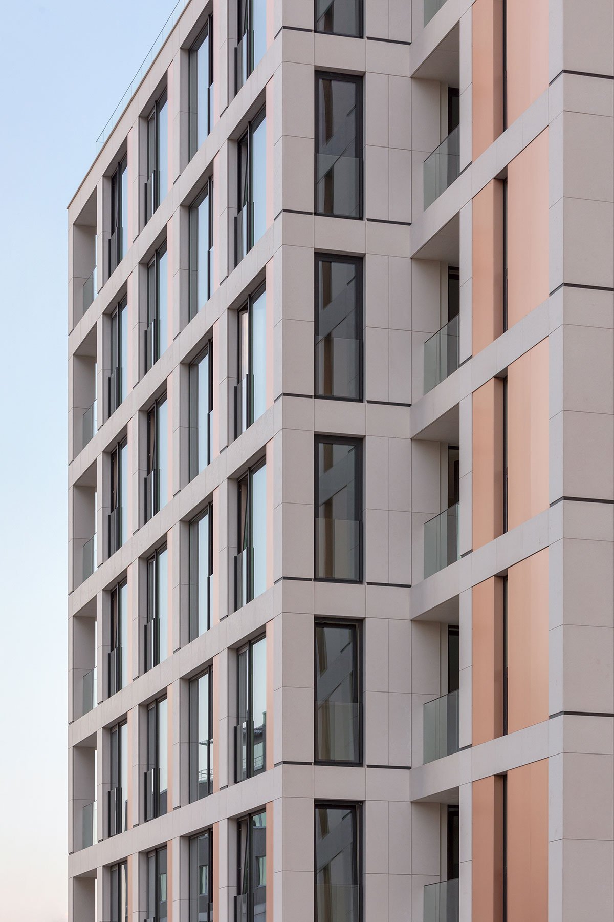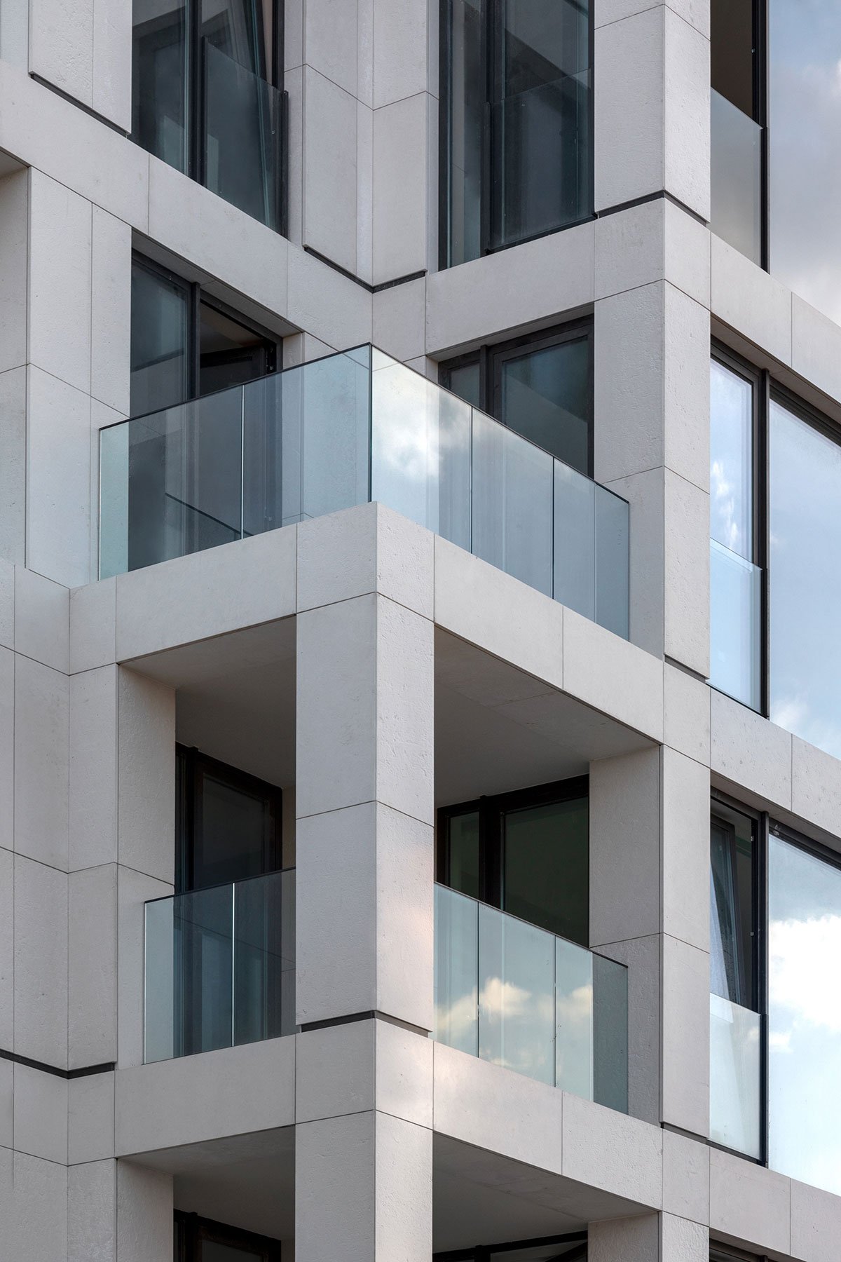 Excerpt: Srebarna 18, a residential building designed by STARH, has an external shell executed as a suspended ventilated façade. The main design element is a minimalist frame made of white limestone – Limra. Its square geometry calms down the dynamic volume and gives precision and order to the building. The materials and colours of the building complement and continue the context, dominated by the office buildings nearby.