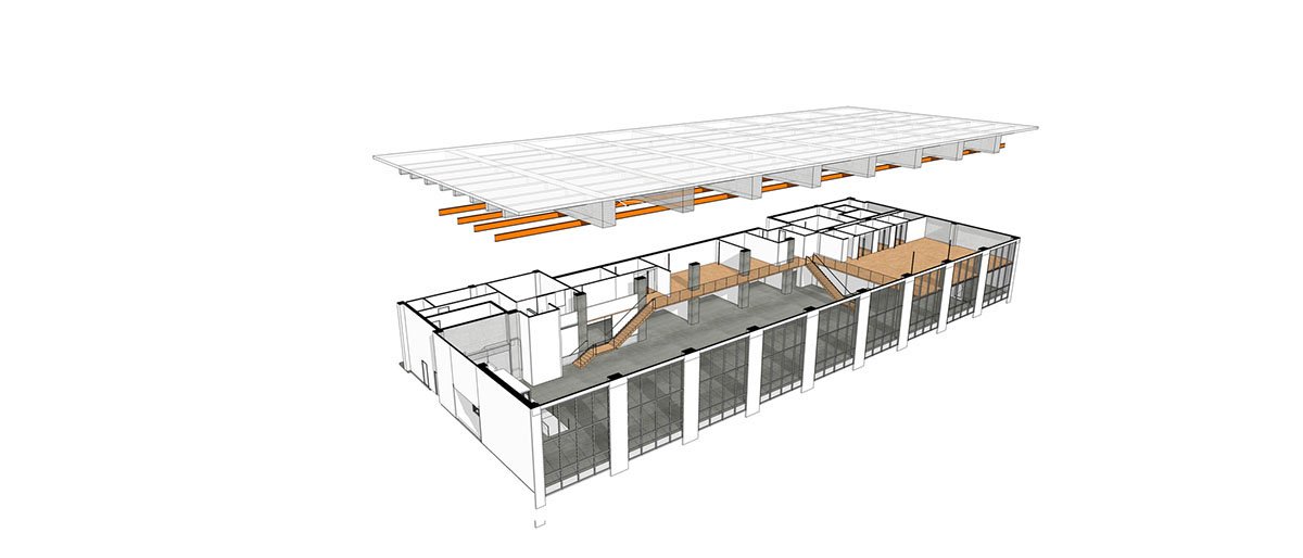 Based on the belief that “buildings are habitats for people,” spaces intentionally connect to nature. Lush trees outside the oversized windows complement ample foliage throughout the interiors; large-scale ceiling fans mimic natural breezes for thermal and airflow variability; and the row of east-facing windows provides dynamic and diffuse light that shifts throughout the day. Raw, naturally textured concrete merges with cross-laminated timber (CLT) at the mezzanine, pods, kitchen and entry.