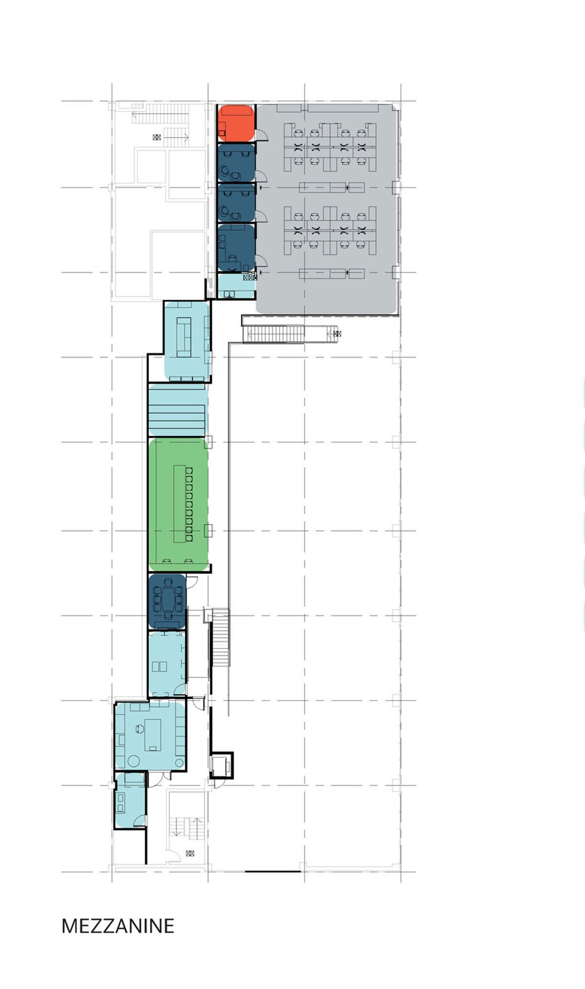 To complement the open and transparent layout, the design provides options to accommodate different working styles utilizing a mix of personal desk locations and densities, plus private areas for small teams and individuals to retreat and focus when needed. Mezzanine workspaces overlook the main level cater to staff desiring quieter, yet still connected, spaces.