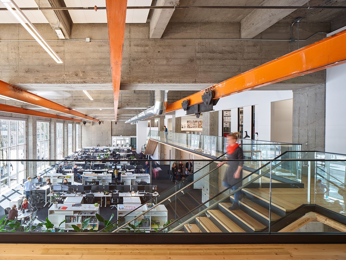 [Text as submitted by architect] The design for the firm’s Portland office effortlessly connects people to each other, the firm’s work, and their creative resources by encouraging spontaneous interactions and accessible views of each other’s current, in-the-moment projects. This high degree of engagement directly translates into an active design environment cultivating better work, stronger relationships and fantastic energy. The new 17,054-square-foot studio is in the former home of The Oregonian’s printing press, located on the ground floor of the 1948 architectural landmark building designed by noted Portland architect Pietro Belluschi. The vacant, barrier-free, light-filled space presented an opportunity to explore how a new office concept could continue to evolve the firm’s practice and culture while simultaneously demonstrating the firm’s commitment to design excellence, sustainability, and wellness. The original overhead steel crane rails were retained to acknowledge the building’s historical function and structure.