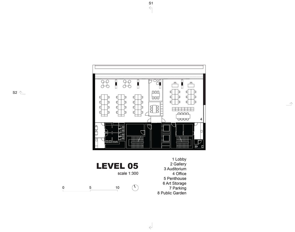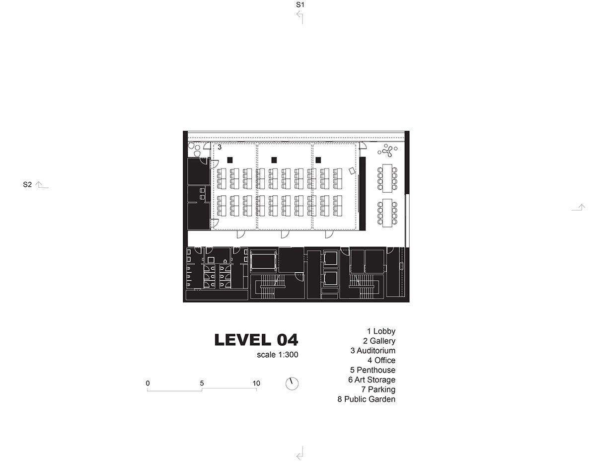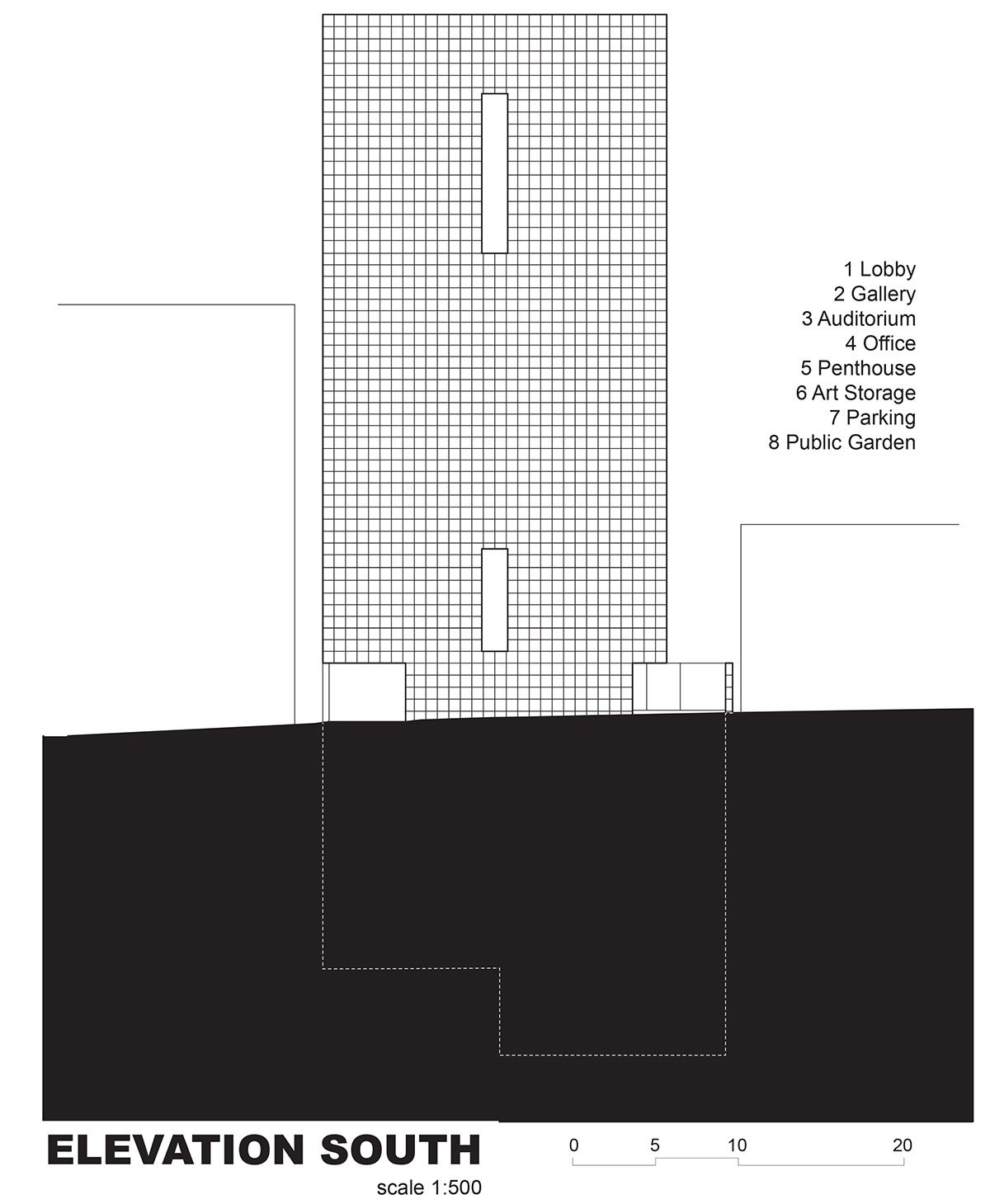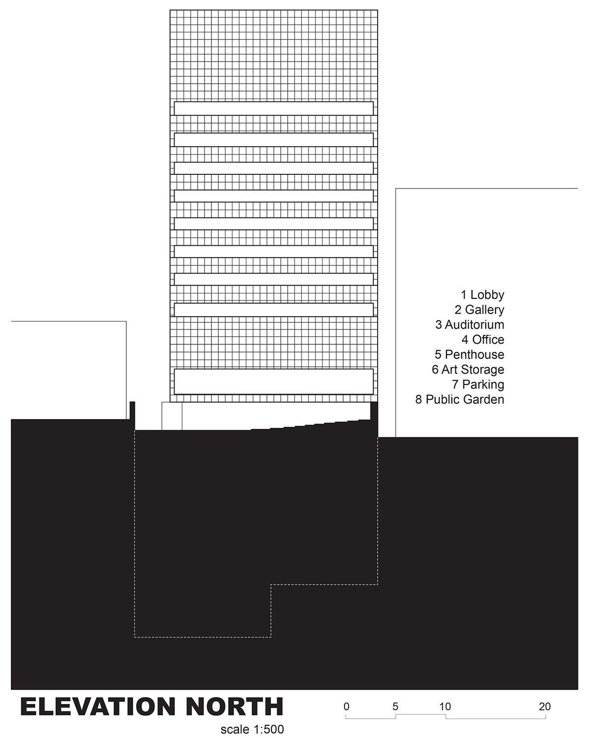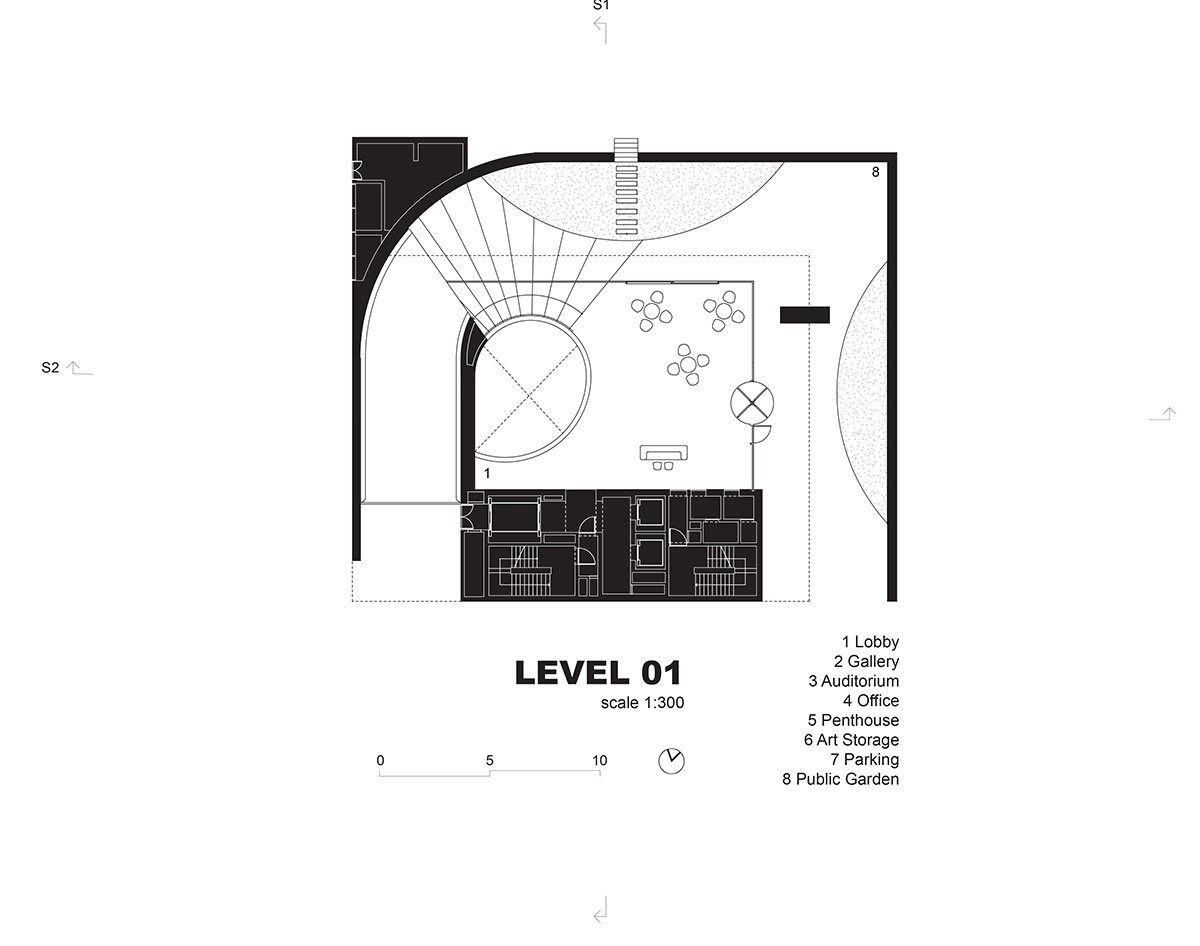 A cultural anchor open to the city: The building expresses difference and openness despite, or rather because of, its hermetic street side. A cut out of the base invites visitors from the street to the main lobby and the intimate garden, open to the public at all times. At the entrance, a column wrapped in a seamless LED screen acts as an attractive lantern announcing current shows and a further place to present artistic content.