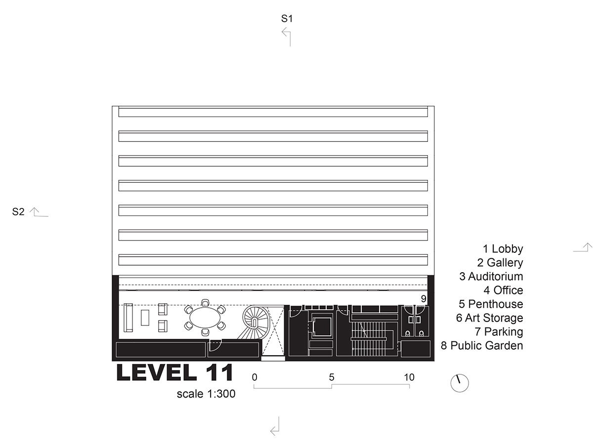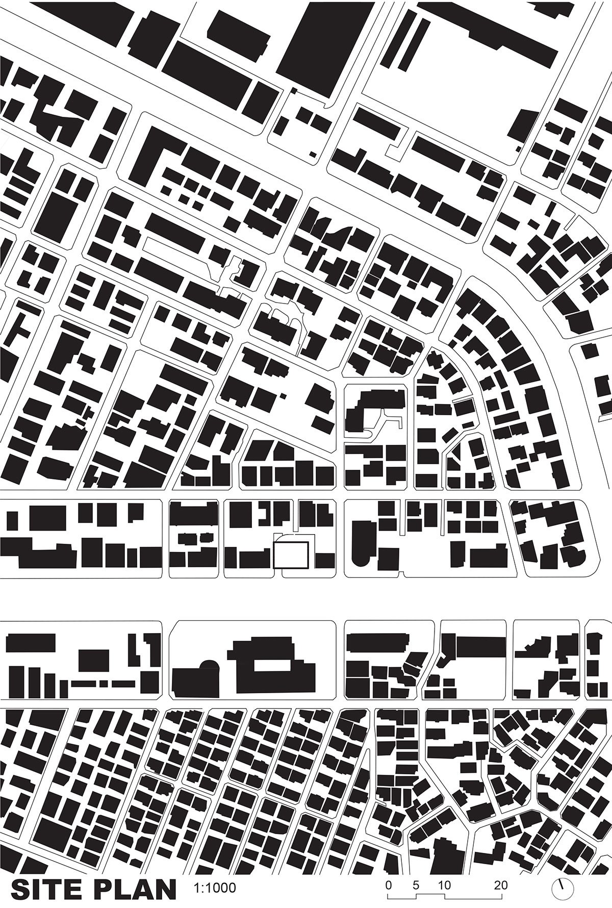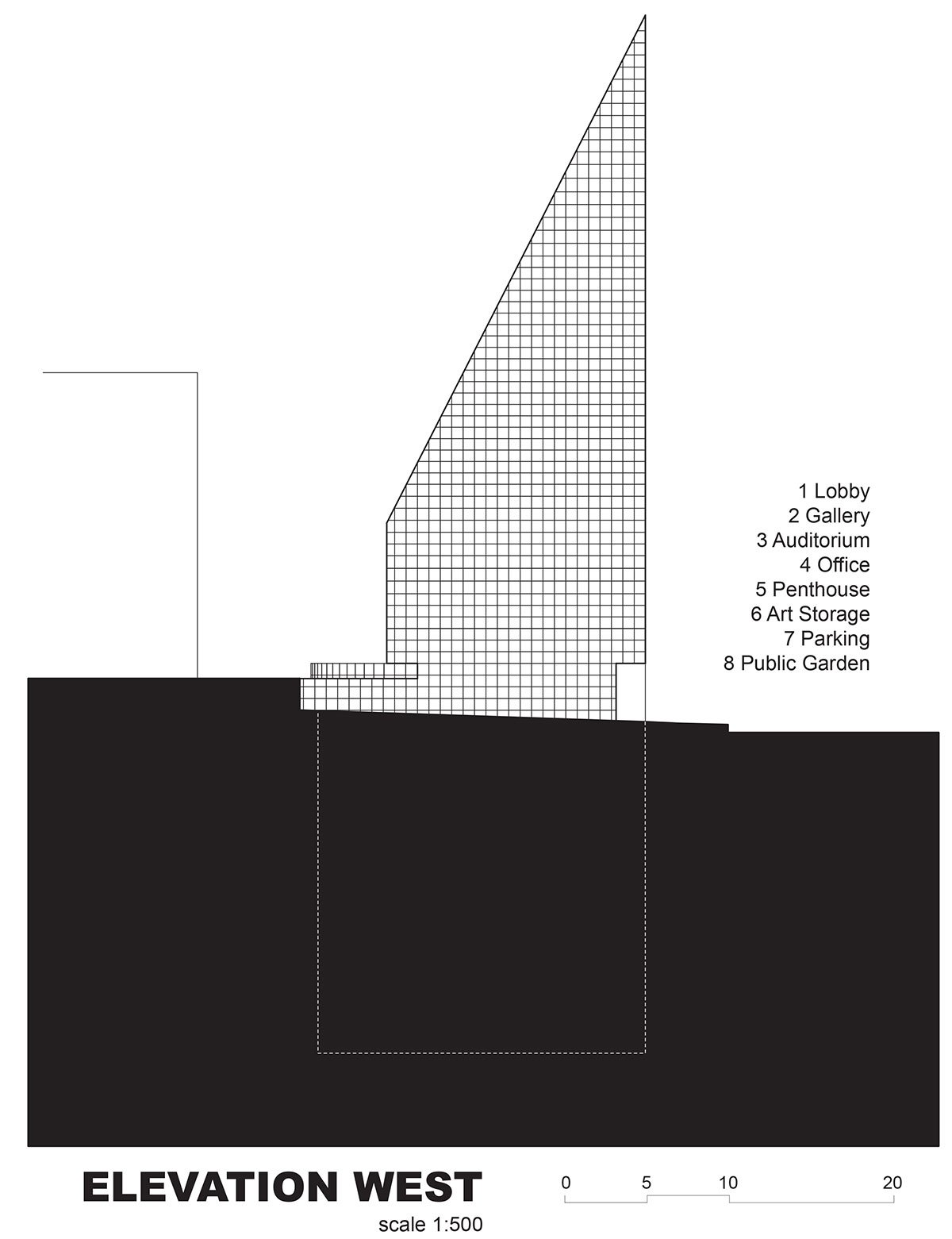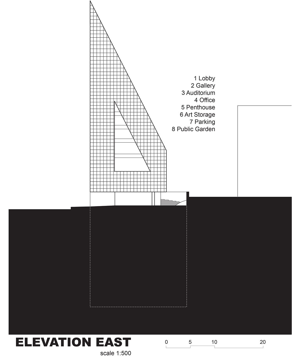 A sharp triangular volume distinguishes the ST SONGEUN Building. Resulting from the envelope specified for the site, the building’s unified form maximizes the allotted floor area while exploring the sculptural potential of the zoning law. A tall front facade faces the main street and hosts the building’s core, and a low back facade faces the garden where a more intimate scale defines the surrounding neighborhood. With 11 stories aboveground and 5 floors underground, the completed building comprises over 8000 square meters.