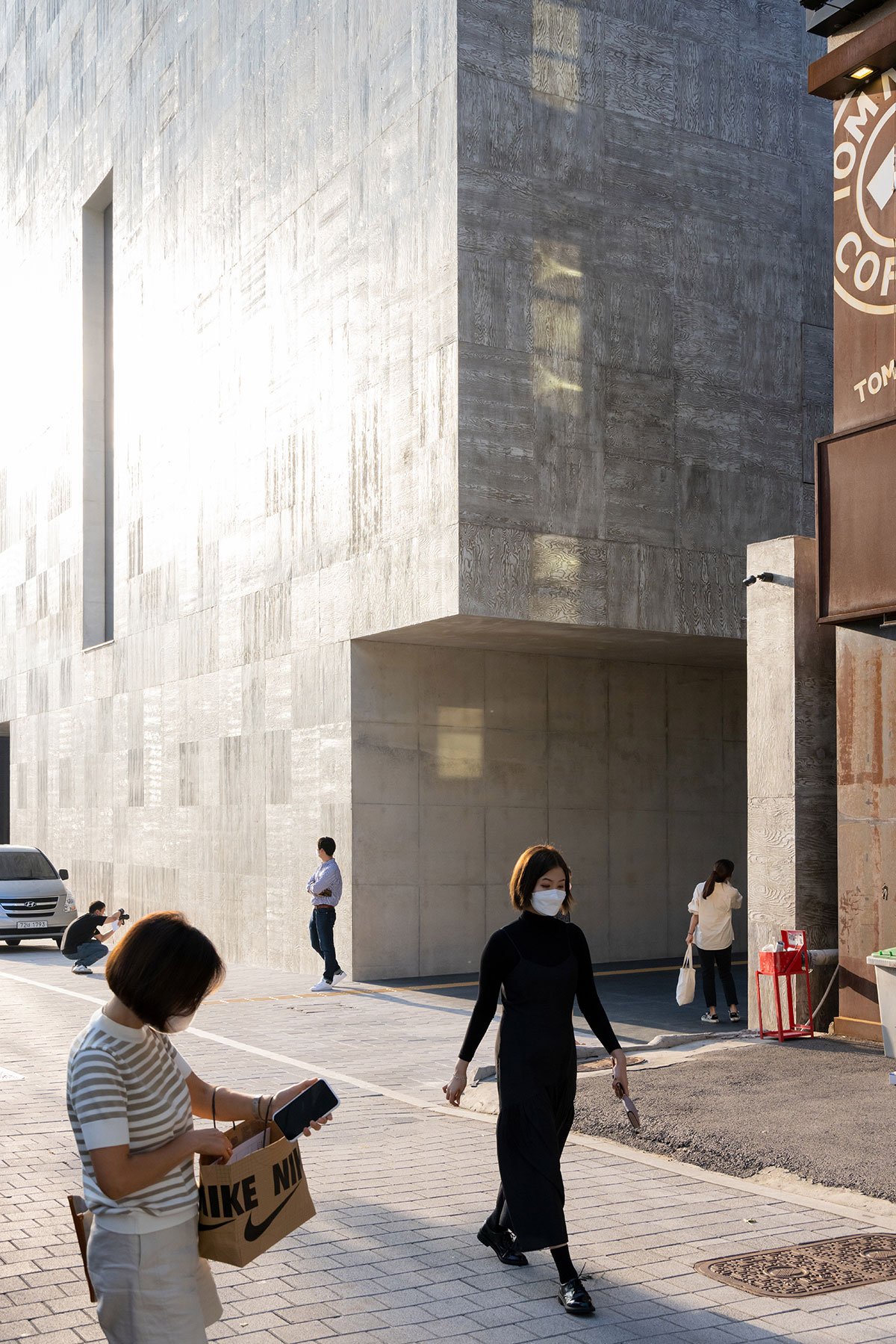 The concrete mass not only carries the entire structure but also defines all space and ornamental surfaces. Using larch plywood boards rotated in a 1-by-1 meter grid, the concrete facade is imprinted with wood grain patterns and expresses the meaning behind the name SONGEUN: “Hidden Pine Tree”. This unique texture invites the eye and hand to explore its different qualities, bringing the building’s urban presence down to a tactile human scale.