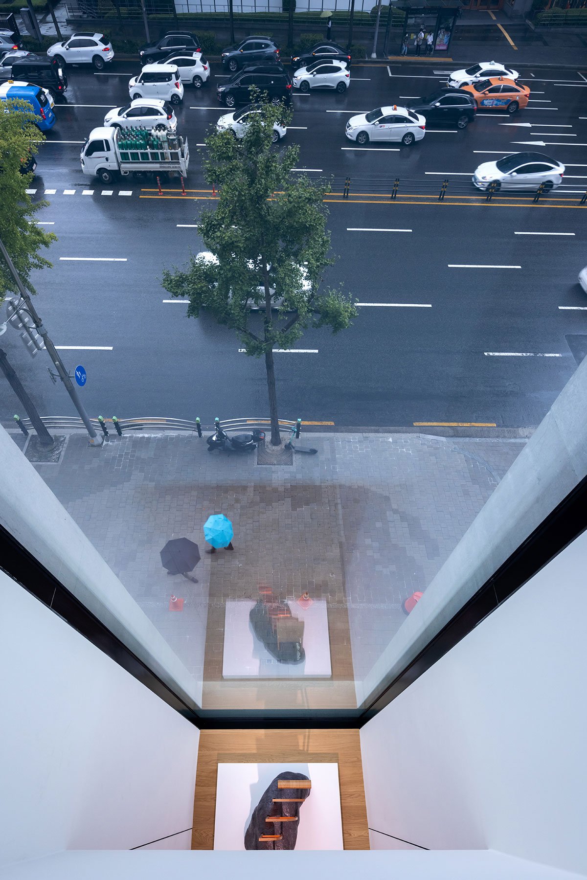 A precise geometry in the heart of Cheongdam Dong: The site is located on the highest point of Dosan Daero, a thoroughfare located in Cheongdam Dong in southern Seoul, renowned for its international flagship stores, restaurants and bars. While the neighborhood mainly consists of low-rise buildings, the zoning allows for higher density towards the main street. Catalyzed by the area’s rapid transformation and densification, a myriad of volumetric strategies responding to various plot regulations sit along the street front.