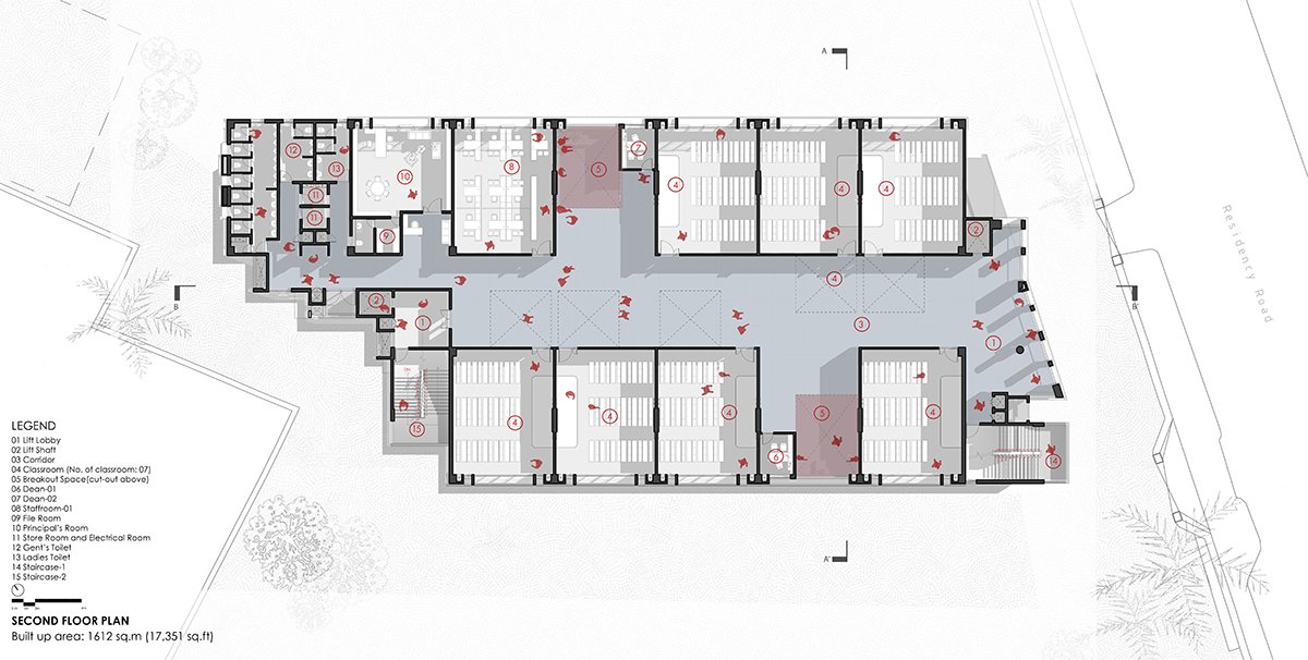 The new building is constructed on a small parcel of land measuring slightly over an acre, in one of the oldest educational campuses in Bengaluru. The site abuts the main road on the south side and has an old existing block on the western side. There is a playground to its north and an open space has been left on its eastern side for future development. The small land parcel in the CBD prompted us to go more vertical for this building, instead of the erstwhile sprawling and ground-hugging buildings of typical Catholic Institutions.
