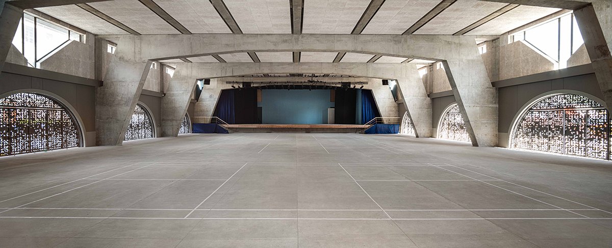 The most challenging part of this project was the 1000-seater column-free multipurpose hall which measures 100′ in width between the outer edges of the columns across the span and approx. 150′ in length. The MPH is acoustically treated to host cultural events apart from having a basketball court. Together with our structural consultant, we devised a Vierendeel system where each column along the eastern and western sides would branch into vertical and diagonal members that would support the floors above by suspending secondary support members. The result of this is a magnificent double-height column-free space at the ground level, flanked with large branching columns, and as they taper in the upper floors, it would make dramatic reveals in breakout spaces and common areas.
