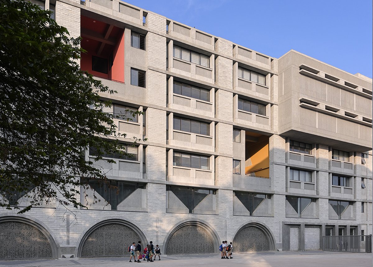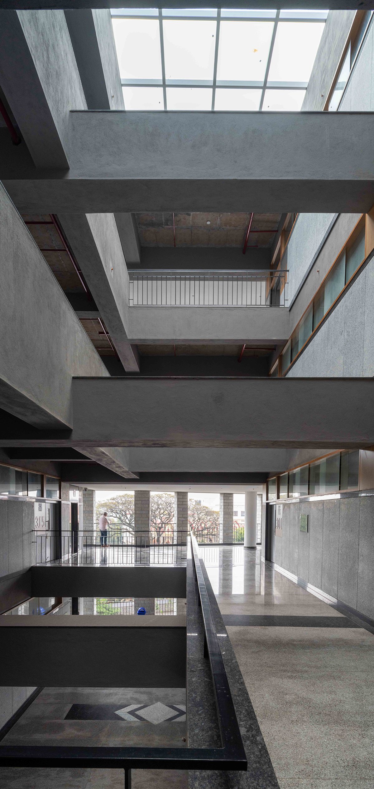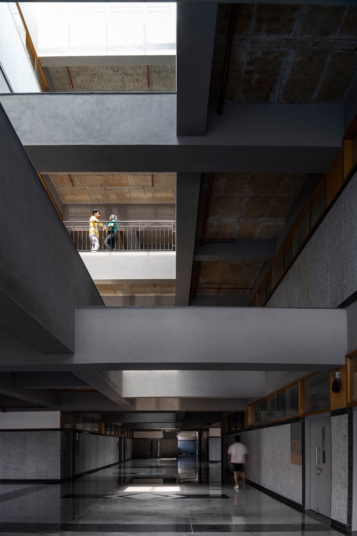 The 1000-seater multipurpose hall occupying the entire ground and first-floor level dictated the arrangement of spaces from the second floor onwards. The classrooms above are arranged on either side of a 25 feet wide corridor on the second-floor level and on subsequent floors, large cut-outs were introduced to bring in natural light and air into the core of the building. We staggered the corridors on alternate floors to enable easy communication across different levels. The central spine acts as a vibrant communal space encouraging chance encounters and interactions within the building. The large mass is punctured by double-height spaces on two levels to create break-out spaces that connect the core of the building to the outer world.