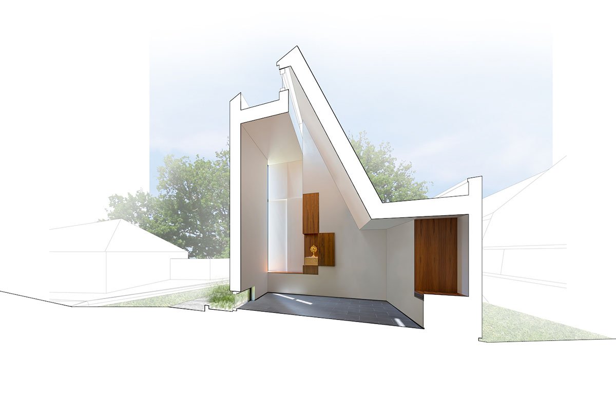 [Text as submitted by architect] Designed as an intimate sanctuary for quiet, individual prayer, the new adoration chapel on the St. Pius campus is a subtle sculptural addition to the landscape. In meetings prior to the start of design, congregants were clear that the new chapel should complement the formal character of the adjacent 1960s church and its striking, monumentally-scaled copper roof, which rises in orchestrated planes from ground level to more than 75 feet above the church floor. The new chapel is a delicately-placed, quiet counterpoint to the adjacent church, contrasting in scale but similar in form and material. The tall, angled shape of the chapel ties the building to its neighbor and creates a soaring space for worshippers within—a cathedral for one. The sculpted form is carefully carved on two sides and at the roof, allowing light to leak in from above the ceiling, along the floor, and adjacent to the sacred tabernacle.