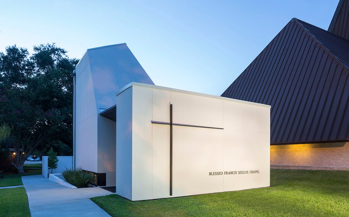 The configuration of the floor plan allows the visitor to enter into a small vestibule separated from the sanctuary by a slatted wood screen wall, affording privacy to worshippers already occupying the space. The space’s power is enhanced by its simplicity; the sculpted volume of white planes is activated throughout the day as the sun washes across the surfaces from different angles. Even the Christian cross, adjacent to the tabernacle, is expressed by grazing light rather than requiring an additional component in the space. The material focus is placed on the custom wood tabernacle containing the Holy Eucharist, drawing the worshippers’ full attention to the object of adoration in a space filled with divine, quiet light and absent of distraction. The Archdiocese of New Orleans selected EskewDumezRipple for the design of the new adoration chapel to replace a nondescript temporary chapel embedded in an existing building. As a truly community-driven, grass roots effort, this project was conceived and approved by the parishioners, who were able to fund the project with a robust capital campaign within the parish. During the planning phase, it was clear that the parishioners desired a significant improvement from the existing facility, to a space more suitable for sacred reflection and worship.