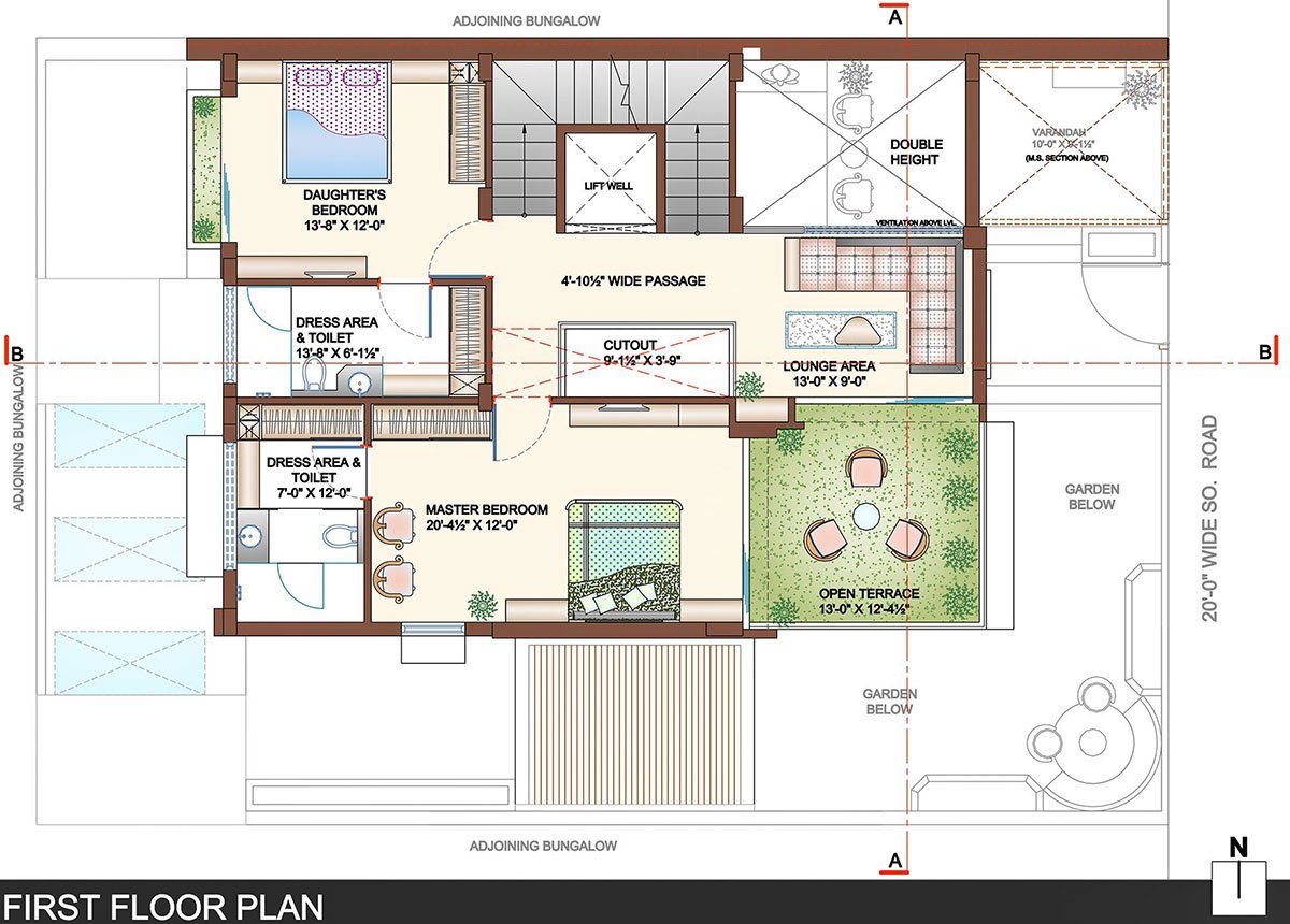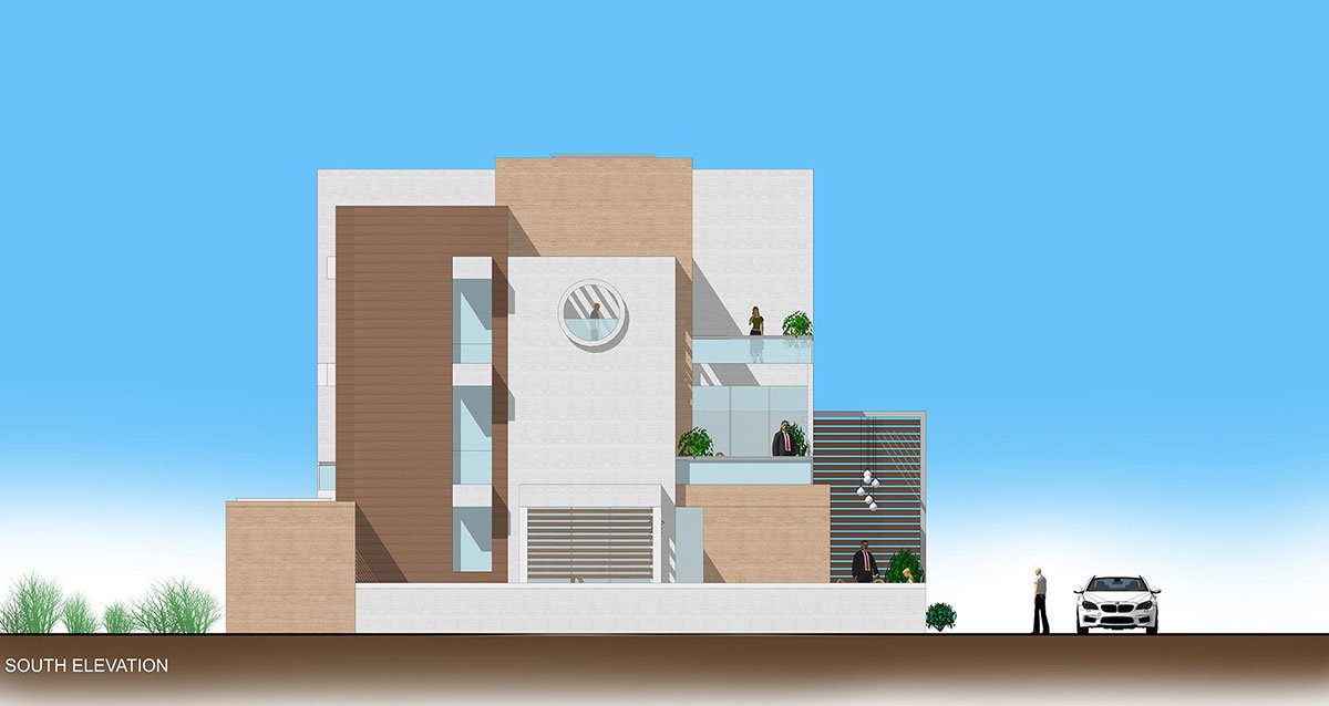 The client’s reason for the selection of this plot was to stay connected with his local groups. The house appears as a set of cubes with varied volumes, arranged with a balanced play of solids and voids. The brief was to create a spacious home with four bedrooms, a drawing room, a dining area, a kitchen, and a formal living space connected to a garden.