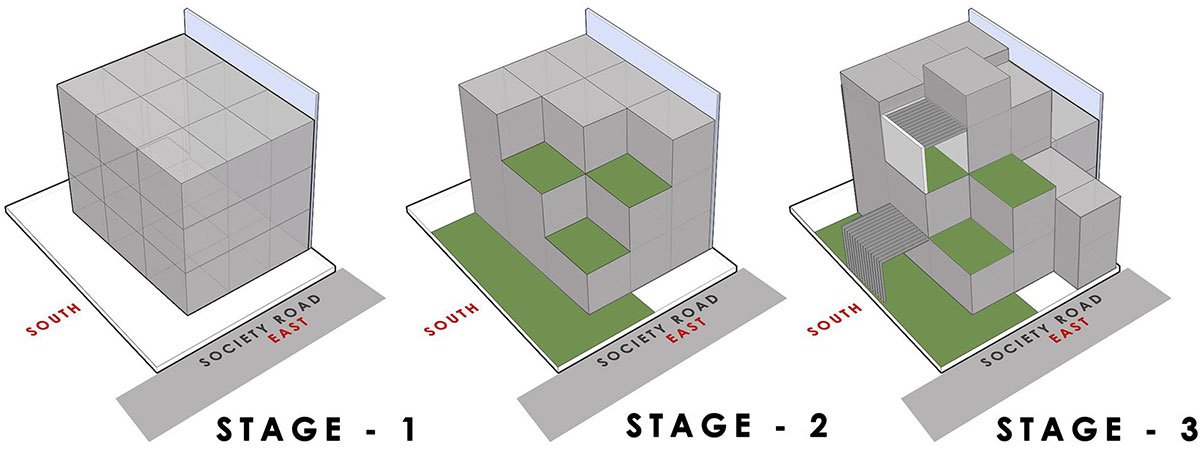 The planning of the elevation is the derivative of the concept of the Stepped Cube House. Articulated as a three storey home, the stacking of the floor plates defined the look of a cuboid which was thereafter integrated with solid volumes and natural steps. The solid top or roof of one volume transforms into the terrace garden for the next volume. The compound wall is pulled up to create a dramatic effect of a flat background from which cubes are protruding.