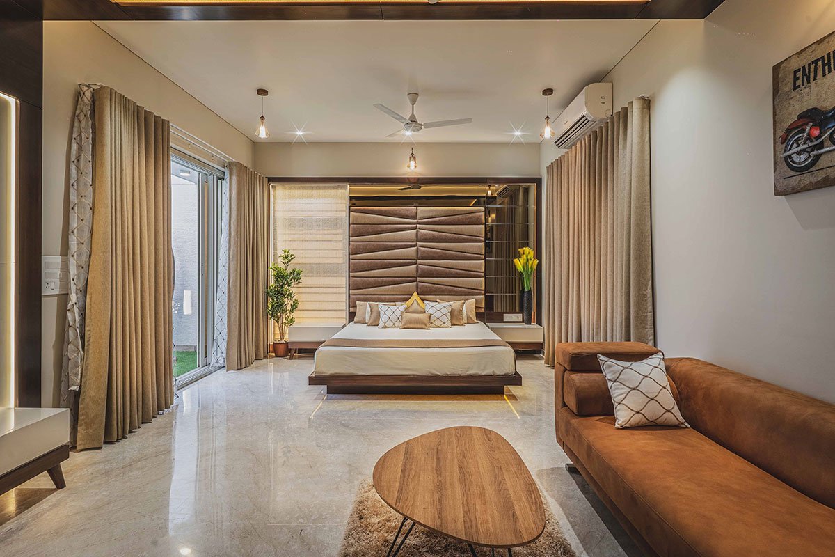 The central solid volume is a slightly raised level that creates shadow on the garden. This brings a play of light and shadow in the exteriors. What makes the built volume more beautiful is the play of textures, materials and the details one encounters with every step as he moves ahead to explore the house. The main door featuring the design of that of ‘veins of a leaf’, the verandah flooring in natural stone mosaic, and the Italian marble flooring inside, are just a few noticeable elements.