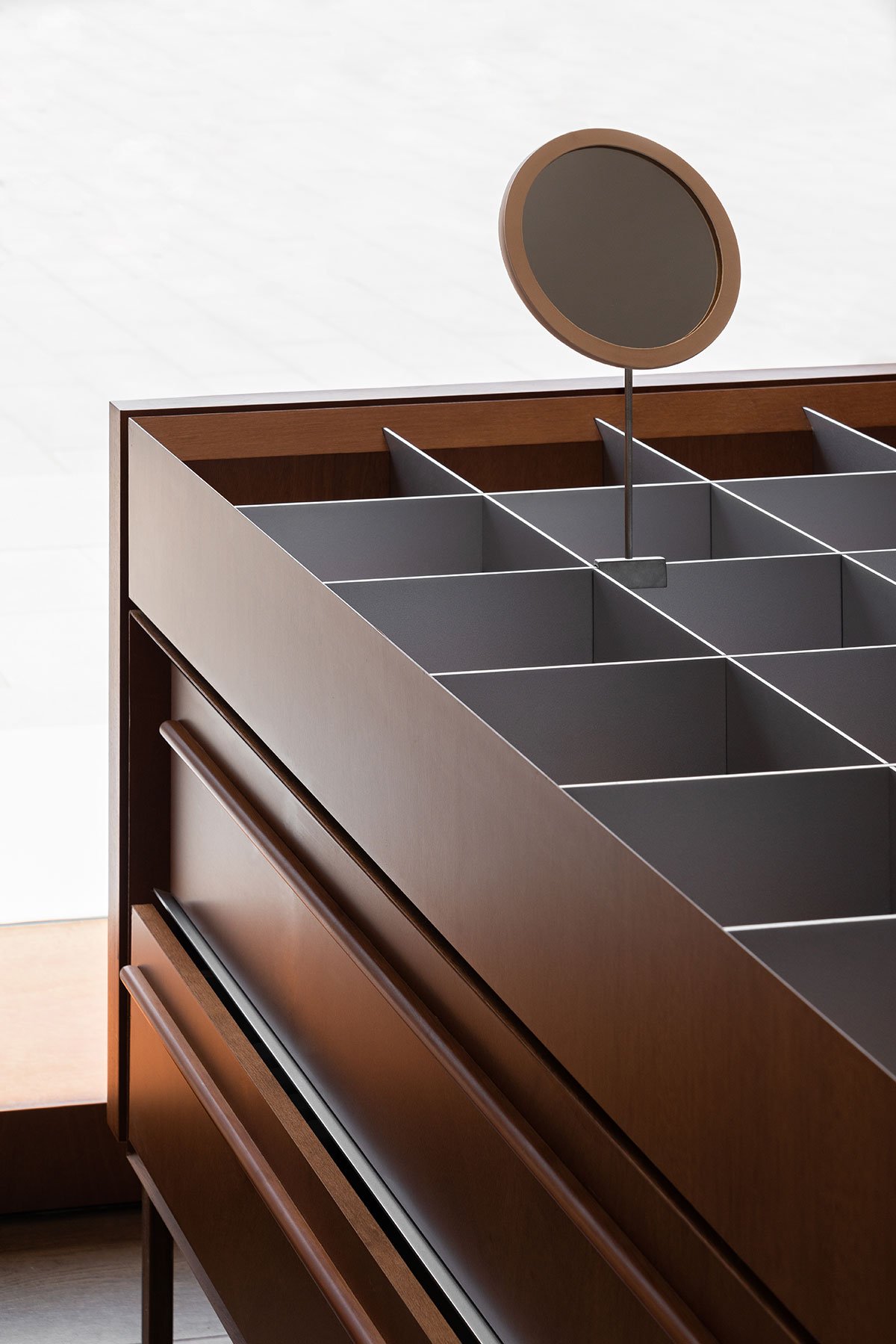 Shelves between columns are separated from walls on both sides as if the cabinet is suspended in the air. Each floor of the showcase is enclosed with solid stainless steel, and the closing position of the wood partition plate is also an angle-cutting treatment, which makes the entire cabinet look light and clean.