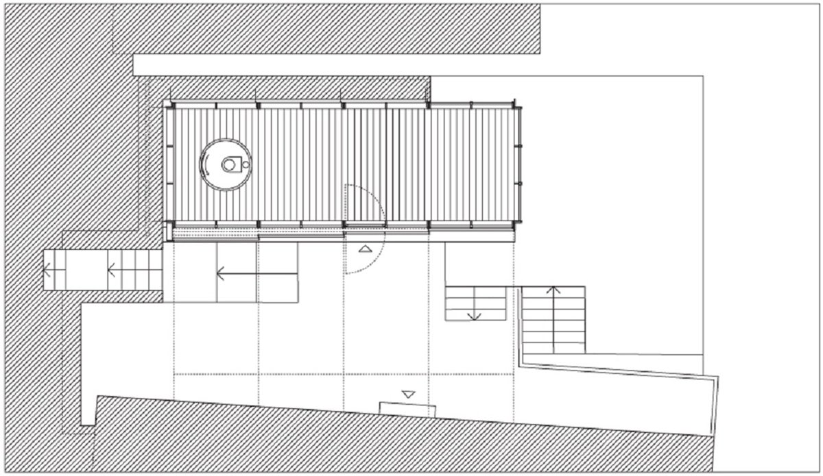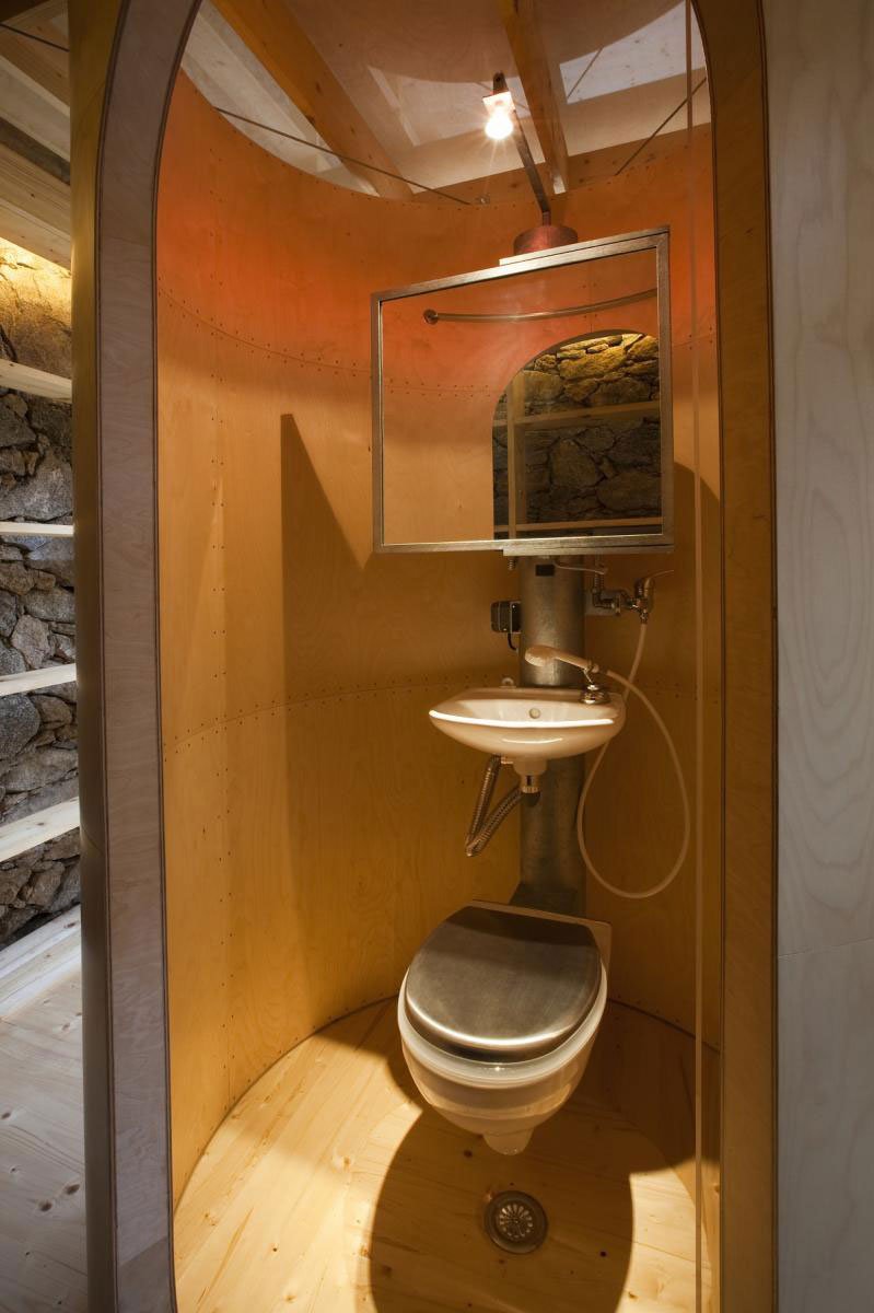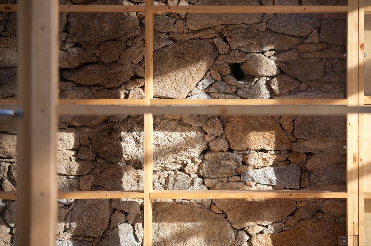 We therefore made a lightweight frame of 180×30 mm spruce wood profiles, integrating the renovated stone wall. The beams are doubled at the joints and bolted at the corners via plywood panel points. There is an area underneath the house which has the utility connections in it. The wooden frame is set on a pair of heat-galvanised I-profiles.