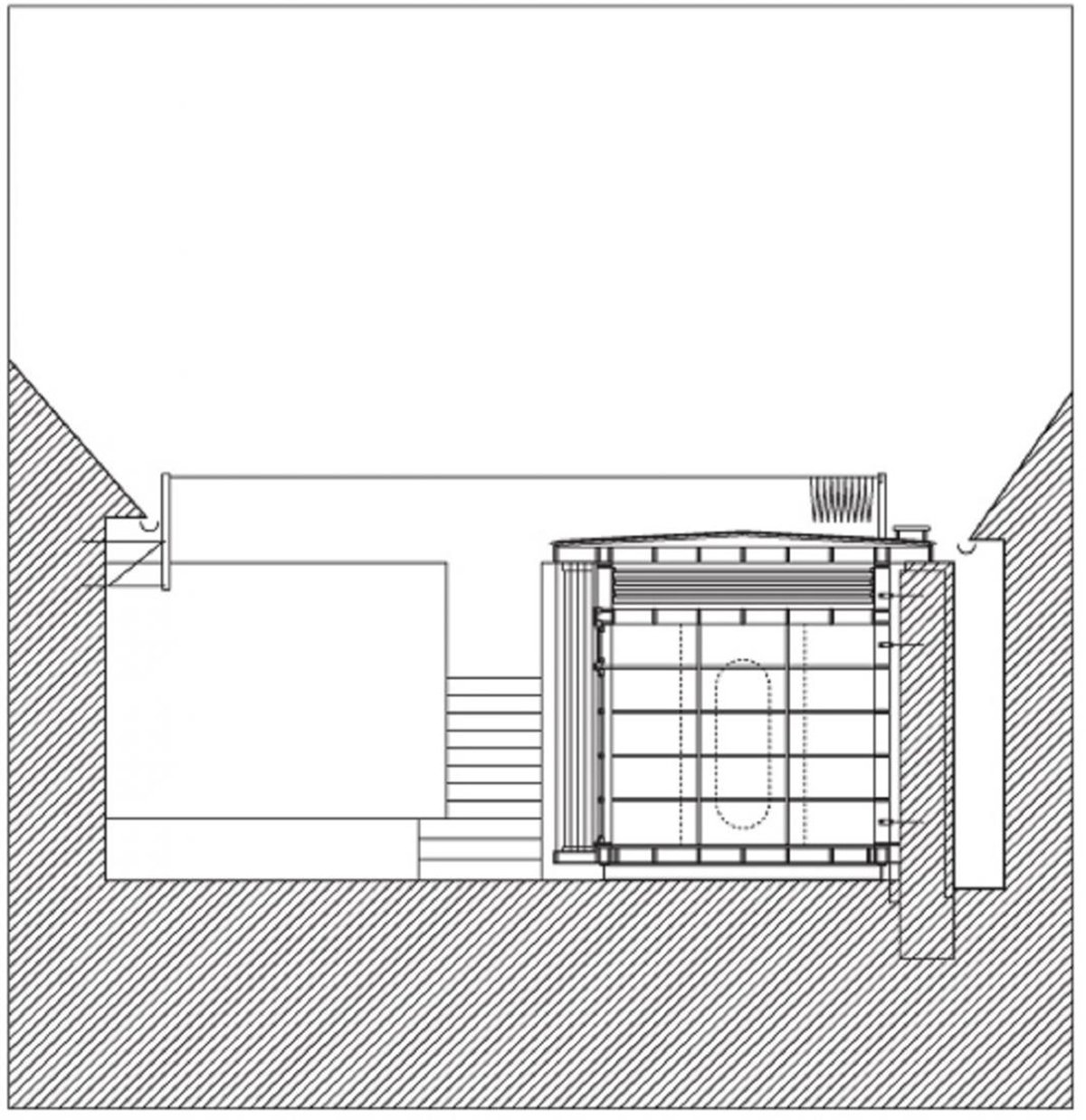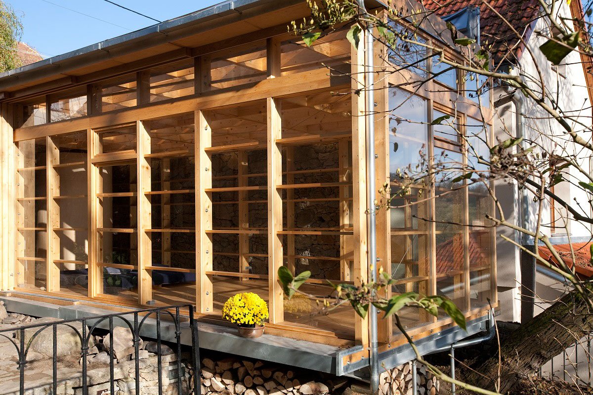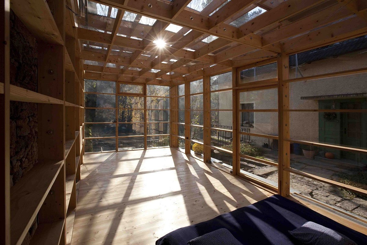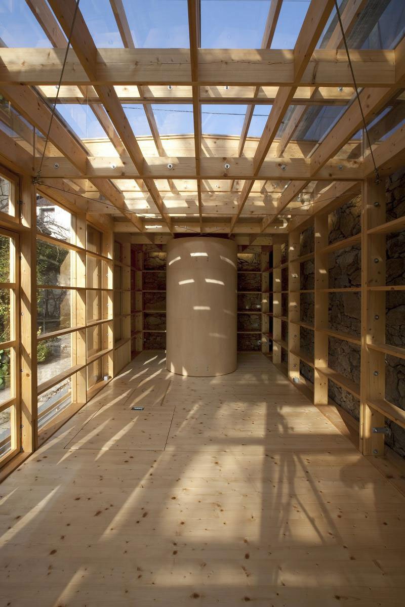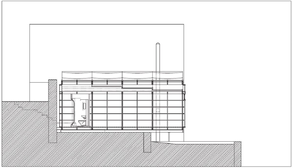 The walls and the ceiling are glazed; people inside draw the energy from the sun and the surrounding country. “Even though I’m in a pretty house, I still find it best to look out.” The glazing is made with single panes, enhanced with sliding thermally insulating panels. The side wall can be covered with thermal insulation from the outside; the ceiling insulation slides inside the double roof cavity. The stone wall has a high rate of thermal accumulation. It can warm the area at night using the heat accumulated during the day.
