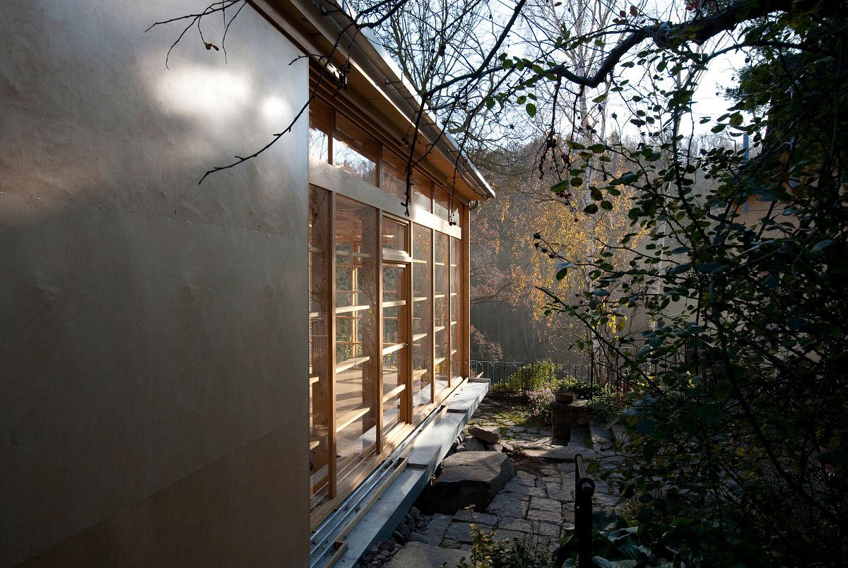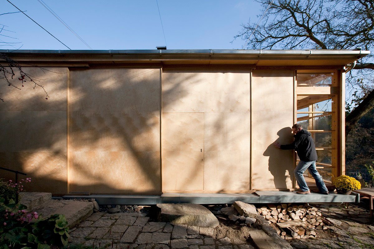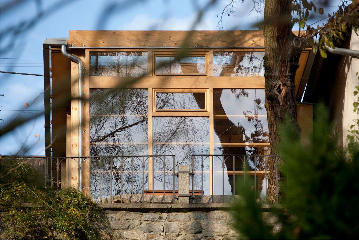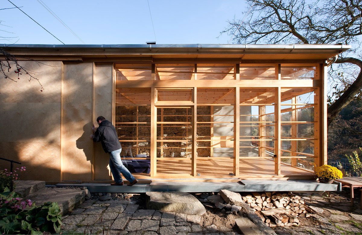 [Text as submitted by architect] The drive behind this commission was a lady investor who sought Martin Martin Rajniš with the request to try and design a studio to fit among some stone houses. There was already an old stone wall on the site, defining a small area below the street level and overlooking a river valley. To us, signs of natural architecture include variability, connection of the interior with the surrounding country, choice of natural materials, and lightness of structures related to the price. A low price was a direct part of the assignment.