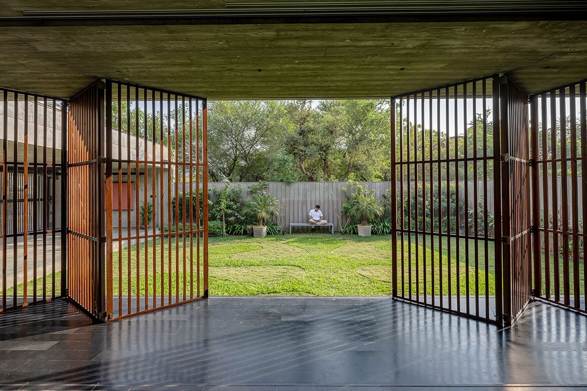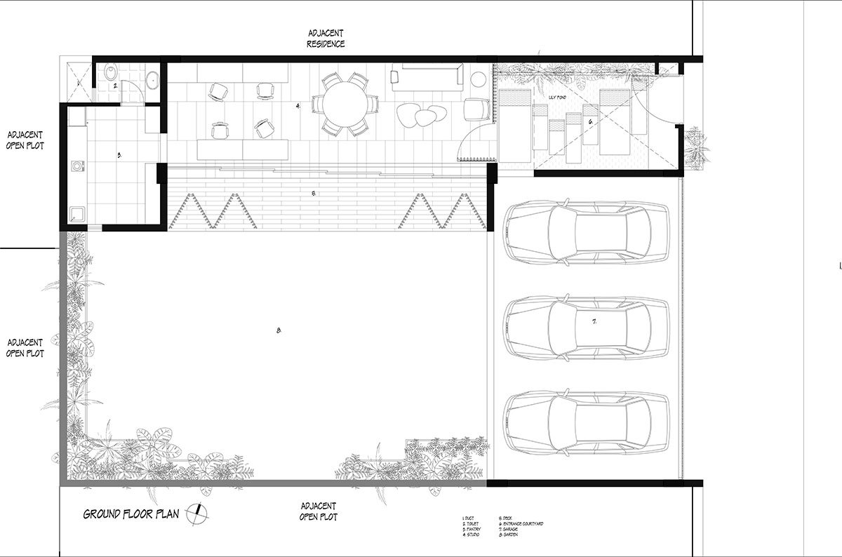 Located on an internal road of a finely defined urban grid of Vadodara, the architectural studio is built in an east facing rectangular plot with an area of around 2600 sqft shares common wall with open plots on west and south direction while north side abutted with a residential building.