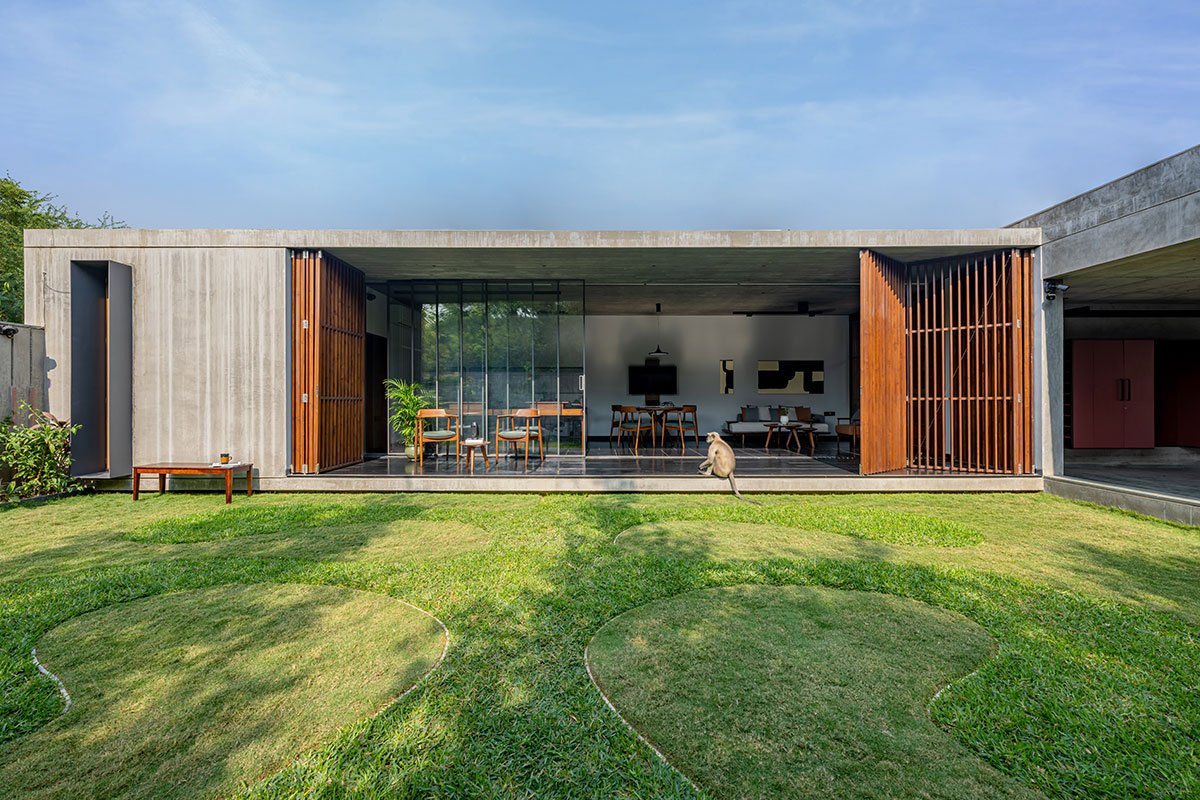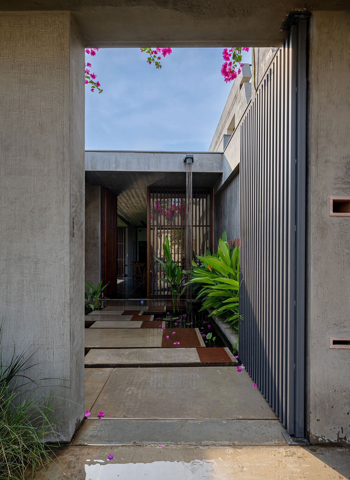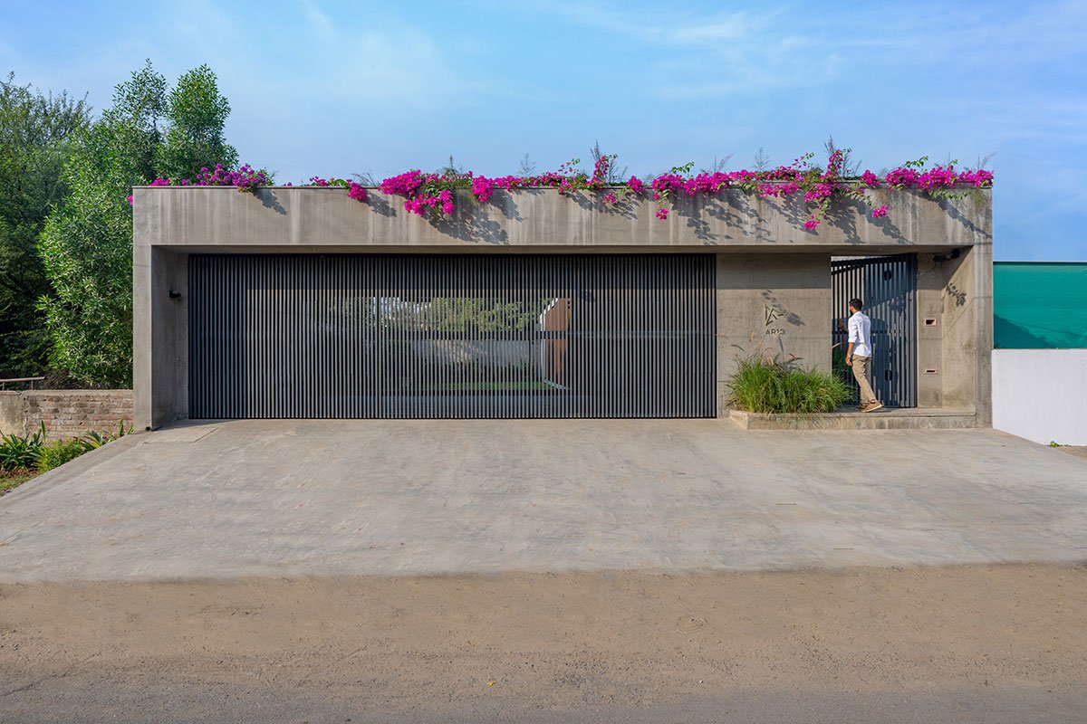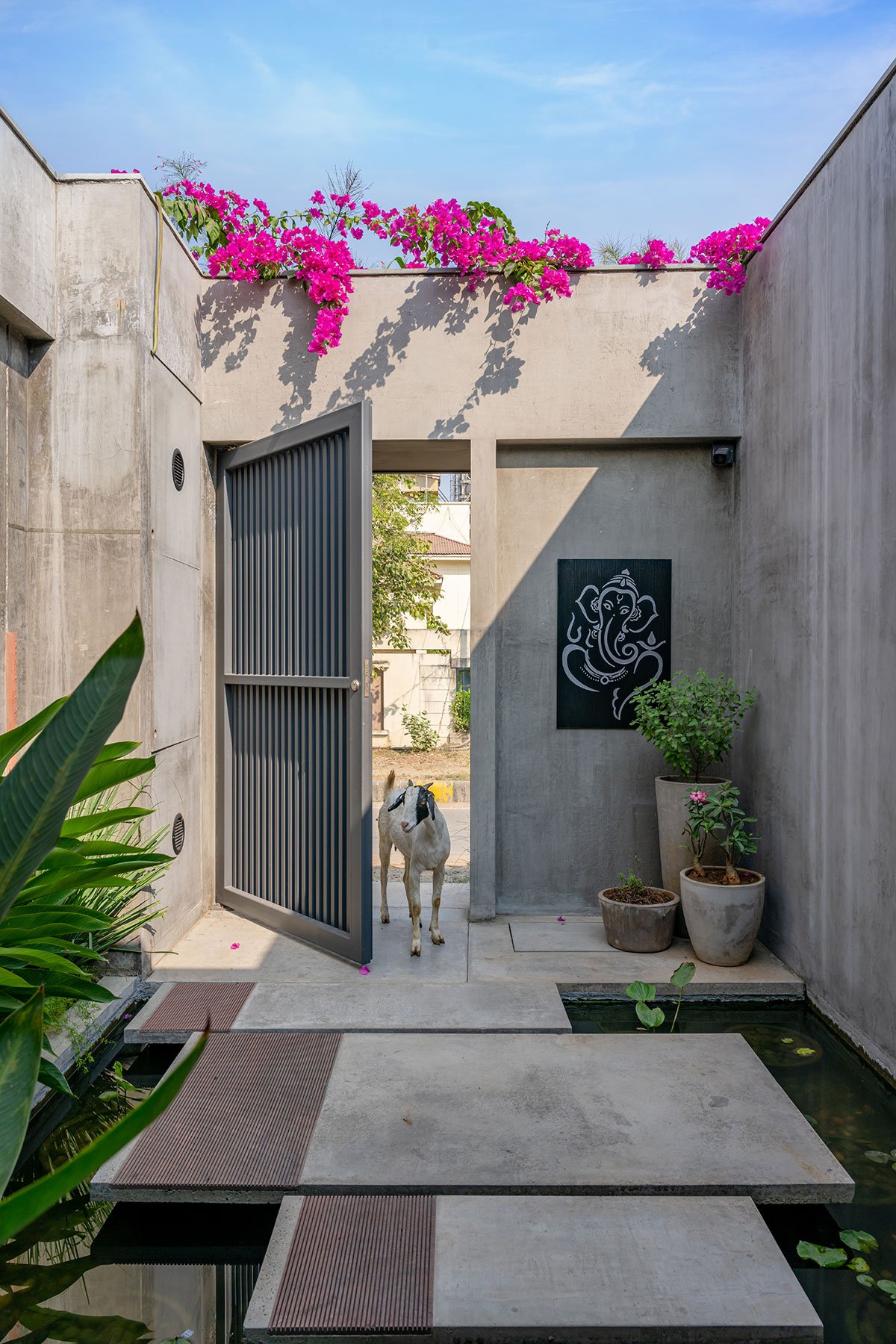 Front elevation is divided in two parts; a pedestal entrance gate and a parking garage gate. The pedestal entrance in the north-east side is through concrete casted steps on a water body with fishes and foliage. The entrance here is a threshold to calm down senses while entering a creative space from busy roads.