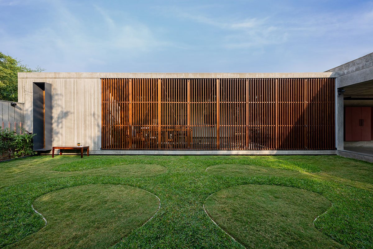 Straight from the pedestal entrance the studio space is a linear building spatially divided as waiting area, discussion area and working space; continuing to pantry, material library and washroom as the peripheral spaces. The enclosed area consists of only a wall on the north and west side, else two sides are large wooden openable doors connecting the green spaces.
