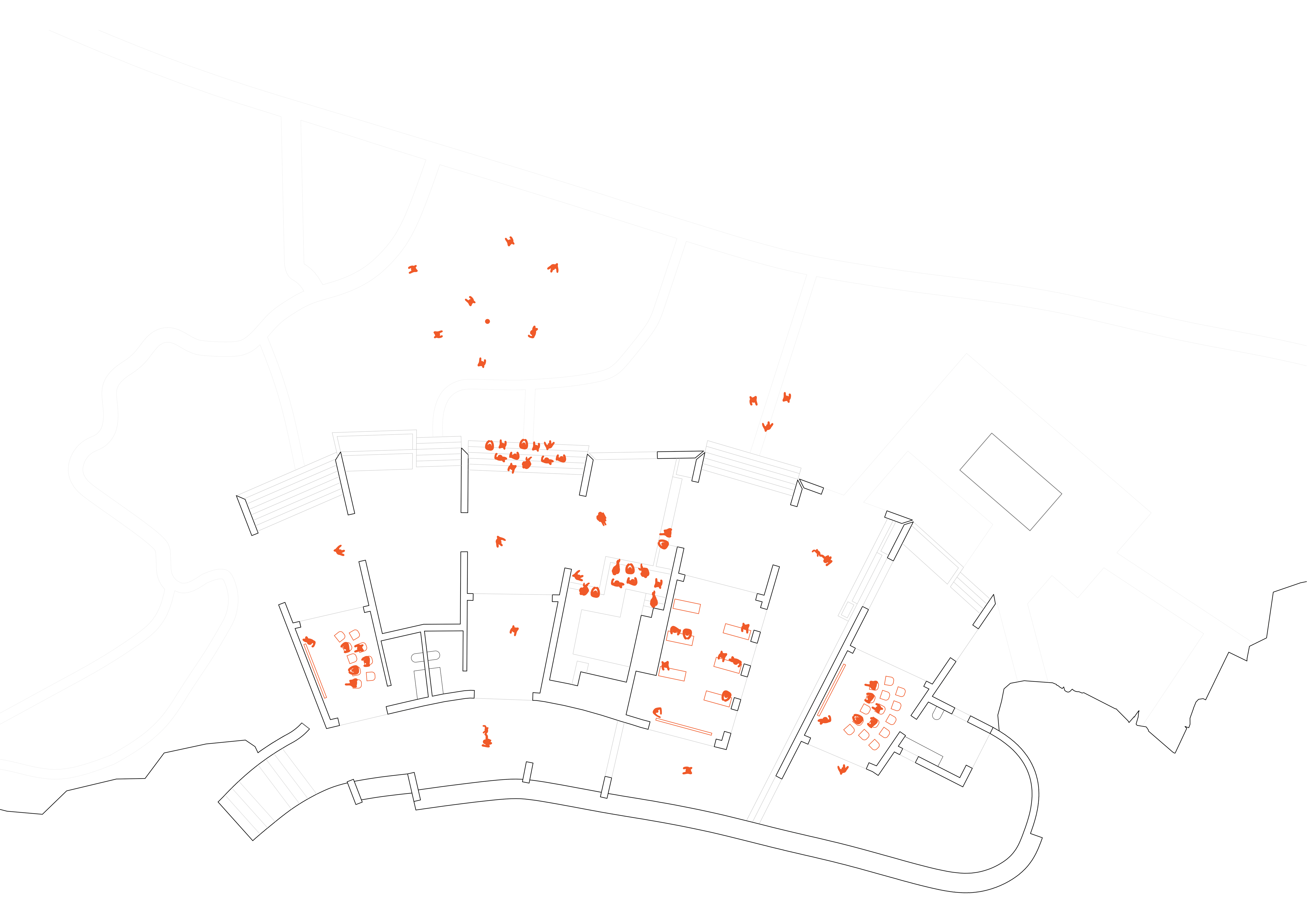 Boulders excavated on site were used for the retaining walls; concrete was used only for the floor slabs, and the mortar for joints contains only 5% cement. Energy consumption is also environmentally compliant, the underground sections and ample shading afforded by the trees doing away with the need for air conditioning, while the sloping site is exploited to create a stormwater collection system supplying irrigation to the local fruit orchards.