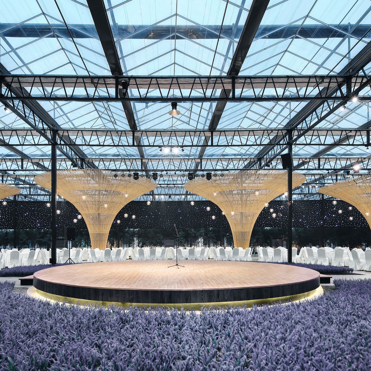 Selection of materials to reflect the country elements, the use of the farm planted yew seedlings surrounding space to form a true tree-lined background, yew release of oxygen to enhance the climate conditions of the site. Yellow-brown bamboo woven into 12 tree-shaped pillars, not only hidden the original construction of steel pillars, weakened its industrial traces, but also in an abstract form of the tree under the space form, forming a forest in the ballroom.