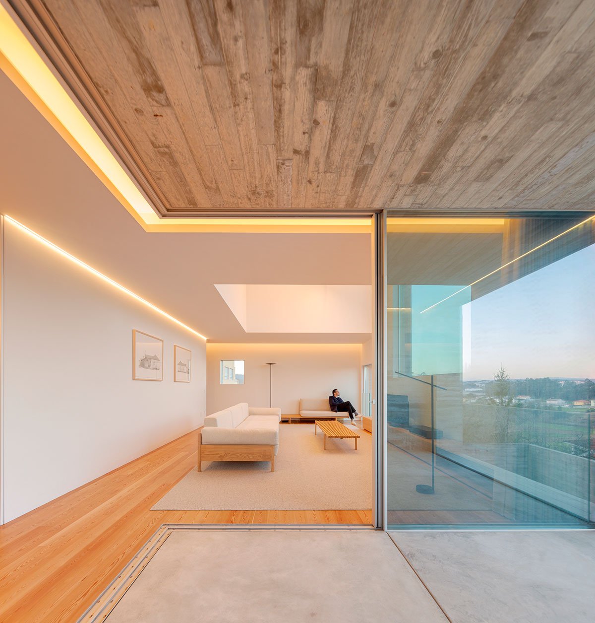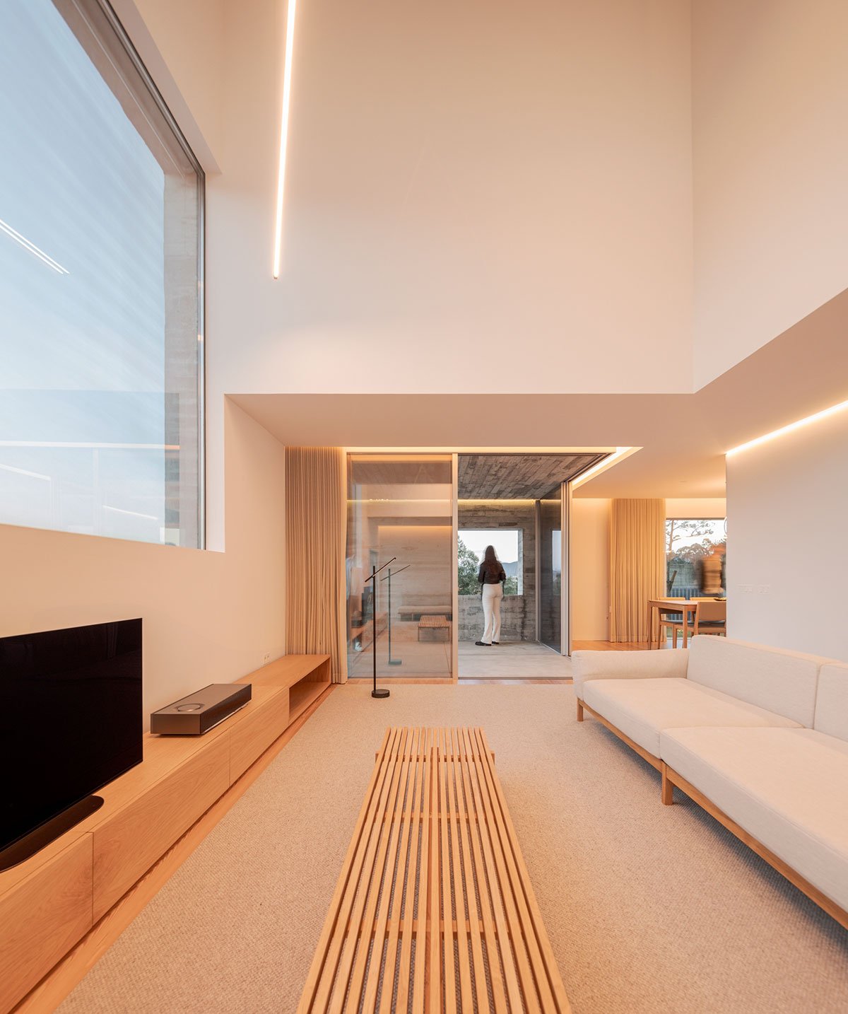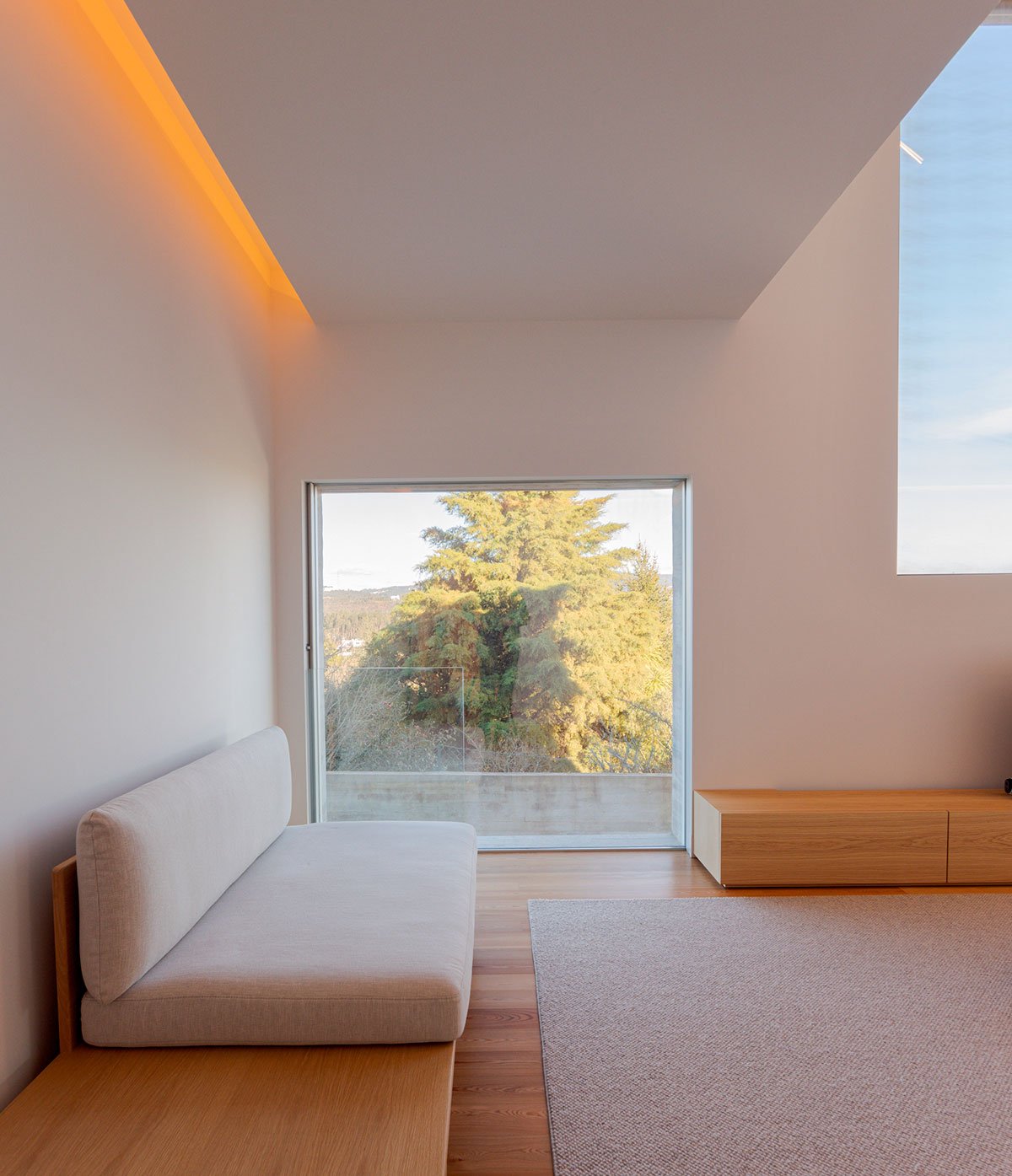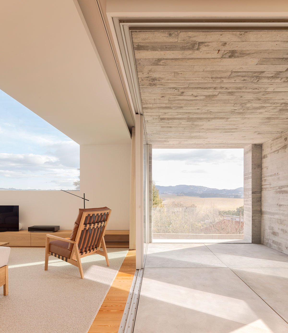 Each space has a critical look at a particular point in the landscape, allowing users different views of the same landscape depending on the position and size of the window they are looking at. On the outside, the use of exposed concrete emphasizes the idea of solidity that the designers wanted to express in contrast to the light wood and white walls of the interior that express lightness. It is also in this dichotomy that the house relates to its neighbours and with those who inhabit it and walk through its spaces.